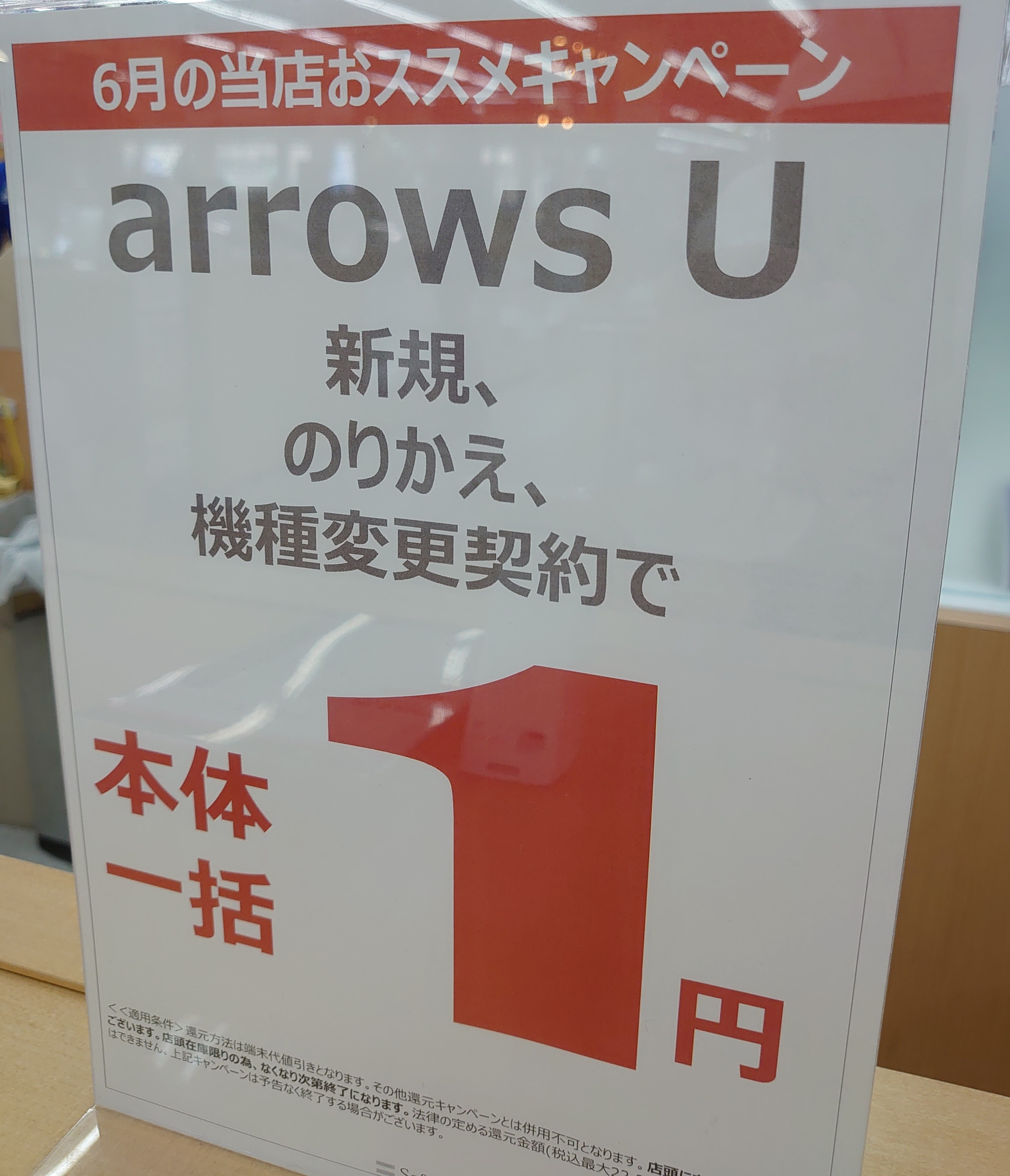ヤマダ電機では、2019年6月28日発売のソフトバンク「arrows U(税込21,984円)」が、機種変更で一括1円となっています。事務手数料は3,300円(税込)です。