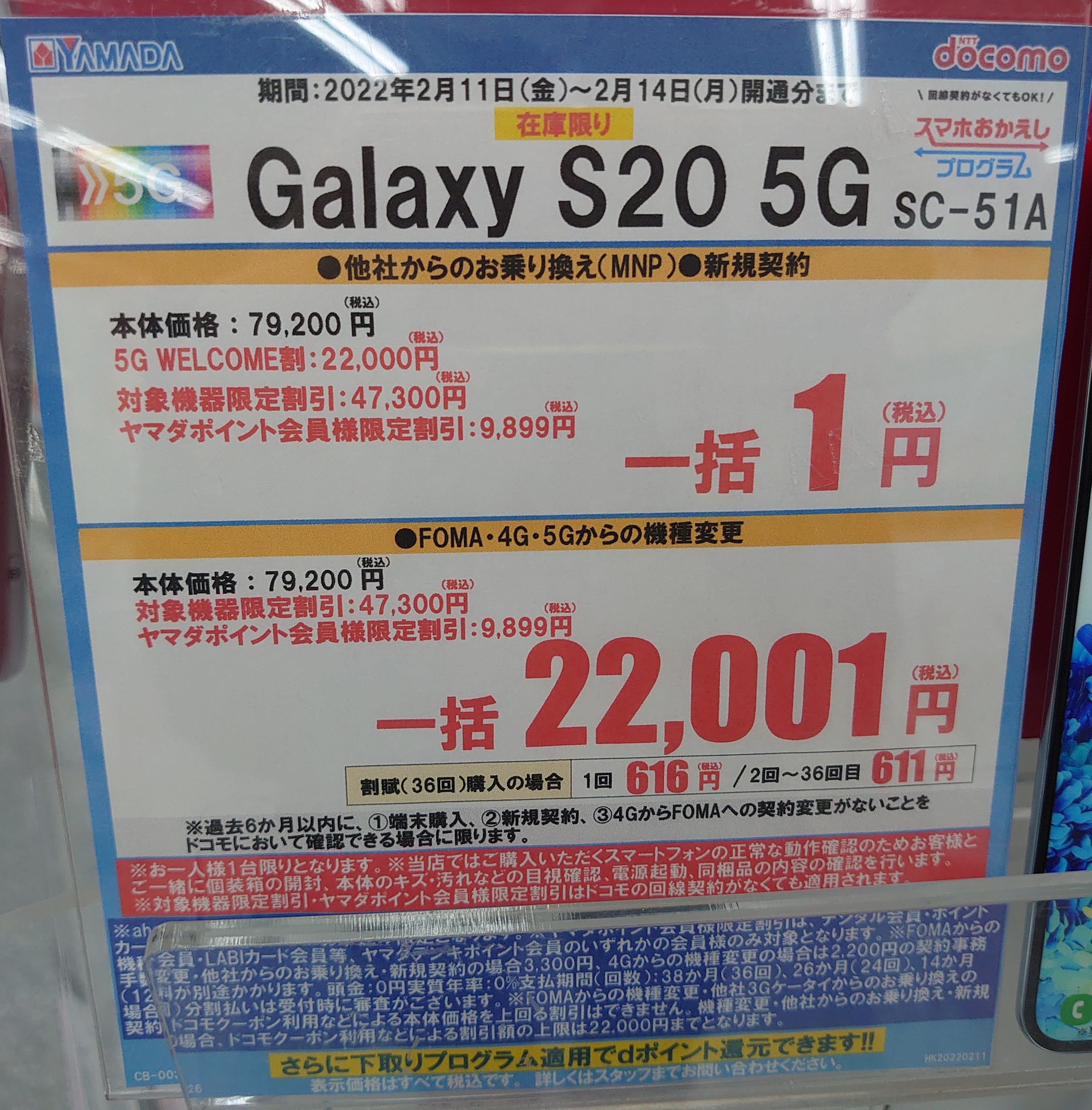 ヤマダ電機ではドコモ「Galaxy S20 5G(税込79,200円)」が新規・MNPで一括1円となっています。FOMA・4Gからの契約変更、及び5Gからの機種変更は一括22,001円(税込)です。