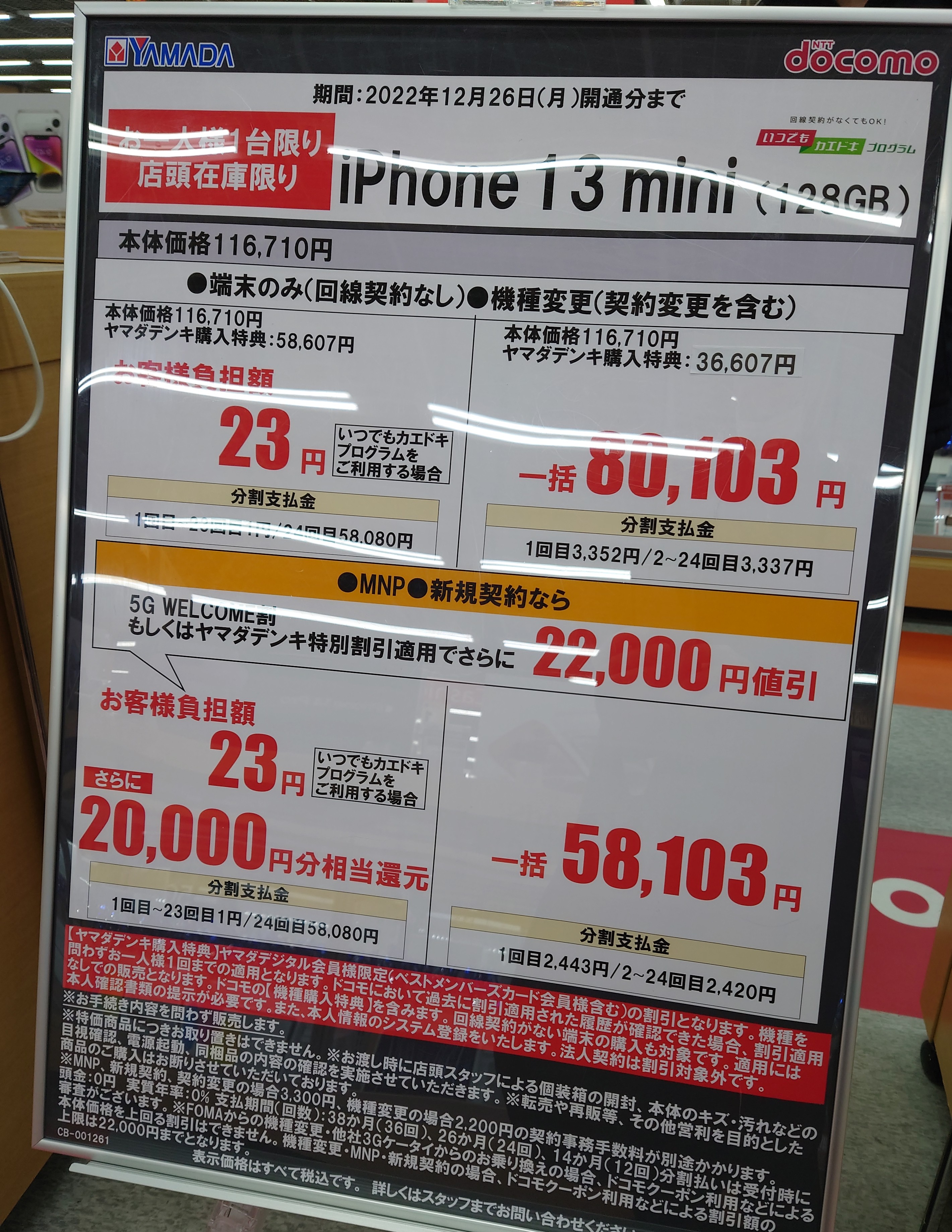 ヤマダ電機ではドコモ「iPhone 13 mini 128GB(税込116,710円)」が、20,000円JCB商品券還元で、新規MNP48回分割総額実質38,103円(税込)の特価となっています。