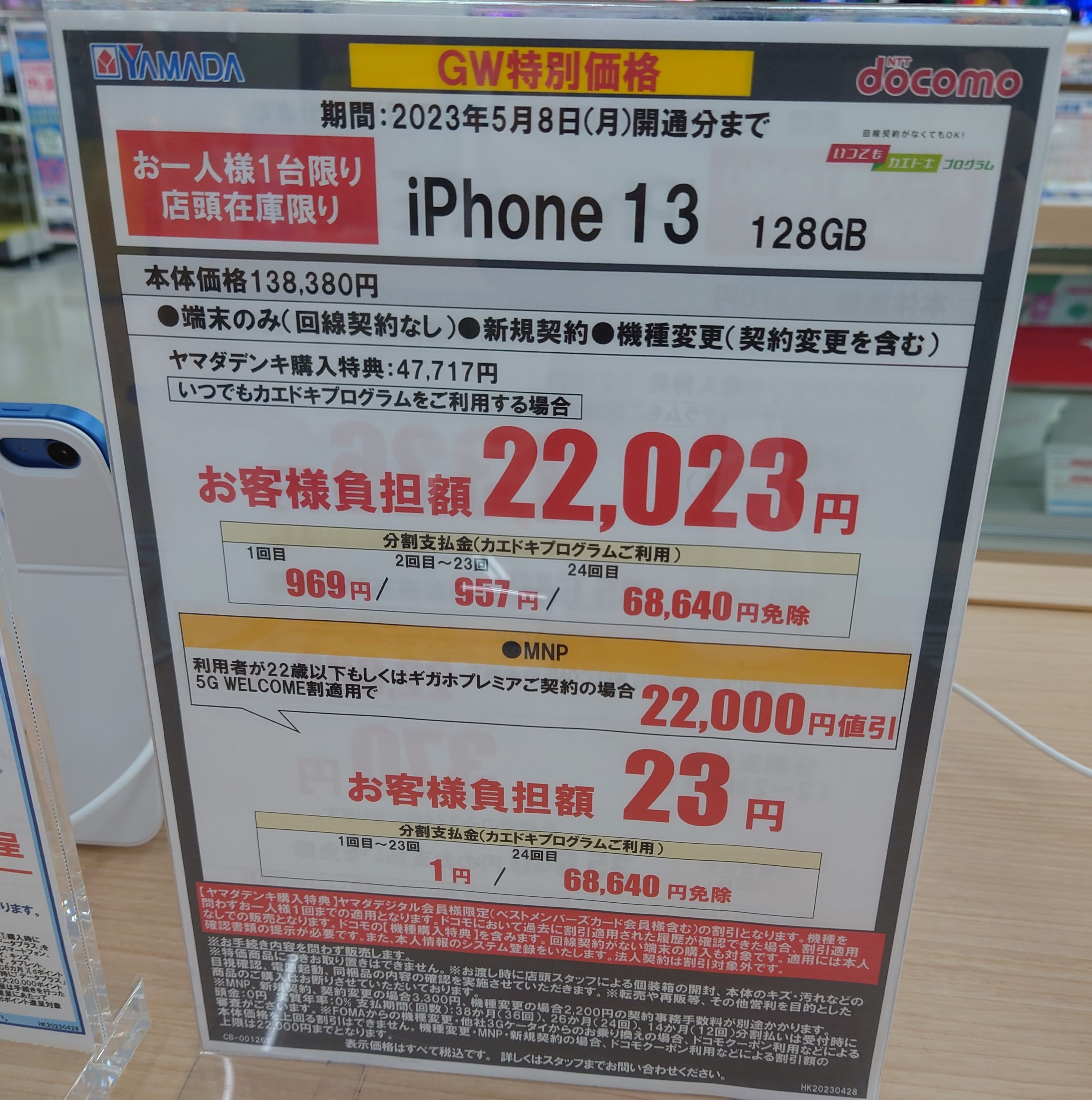 ヤマダ電機ではドコモ「iPhone 13 128GB(税込138,380円)」がMNPで69,717円割引となり、分割支払総額68,663円(税込)となっています。事務手数料は3,300円(税込)。5/8(月)まで。