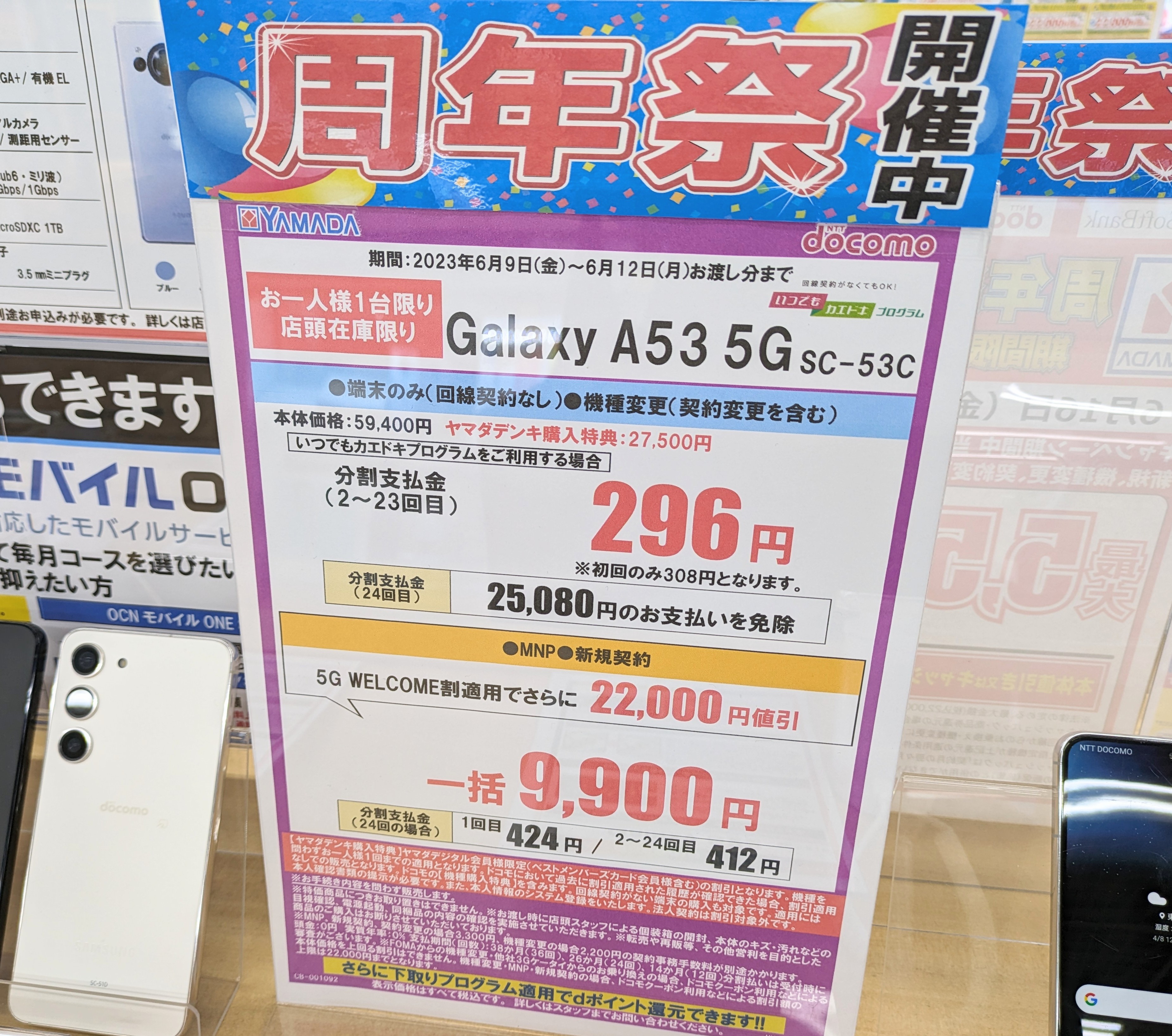 2023年6月10日(土)、ヤマダ電機なんば店では2022年5月発売のドコモ「Galaxy A53 5G(税込59,400円)」が新規・MNPで一括9,900円(税込)となっています。事務手数料は3,300円(税込)。6/12(月)まで。