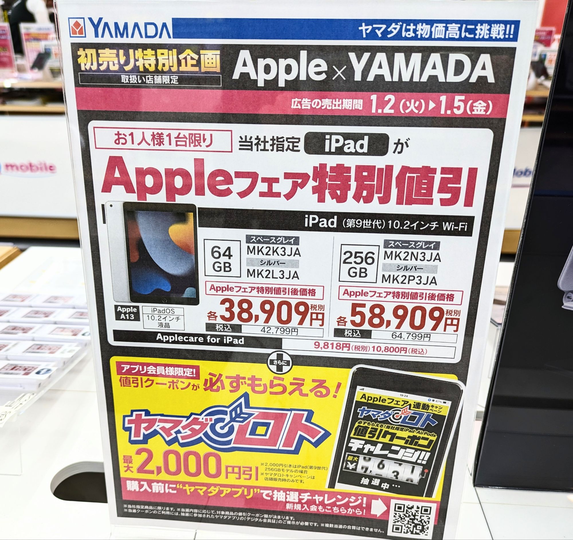 ヤマダ電機では、2021年9月発売の「iPad 10.2インチ 第9世代 Wi-Fi 64GB」が42,799円(税込)となっています。1/5(金)まで。