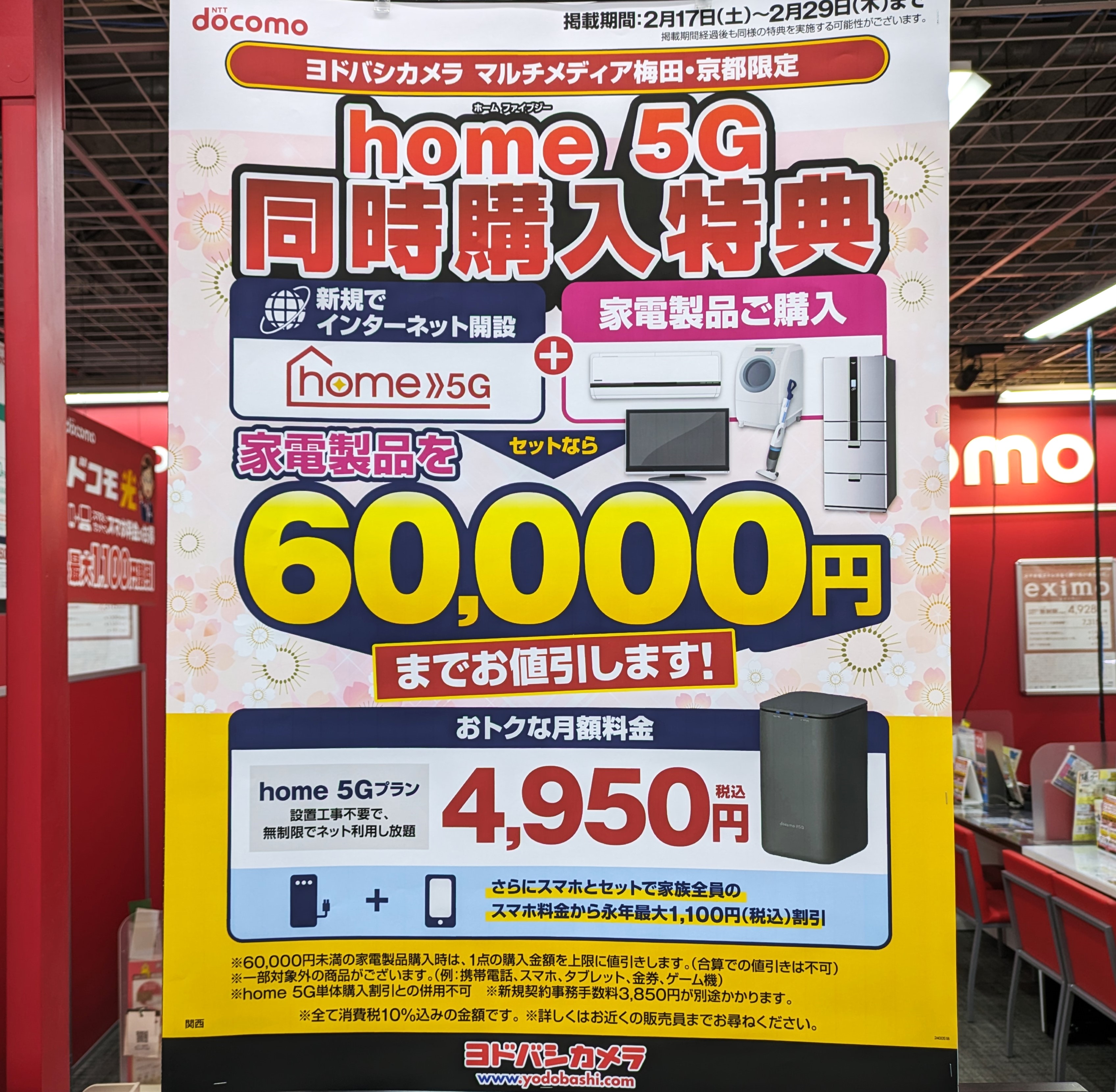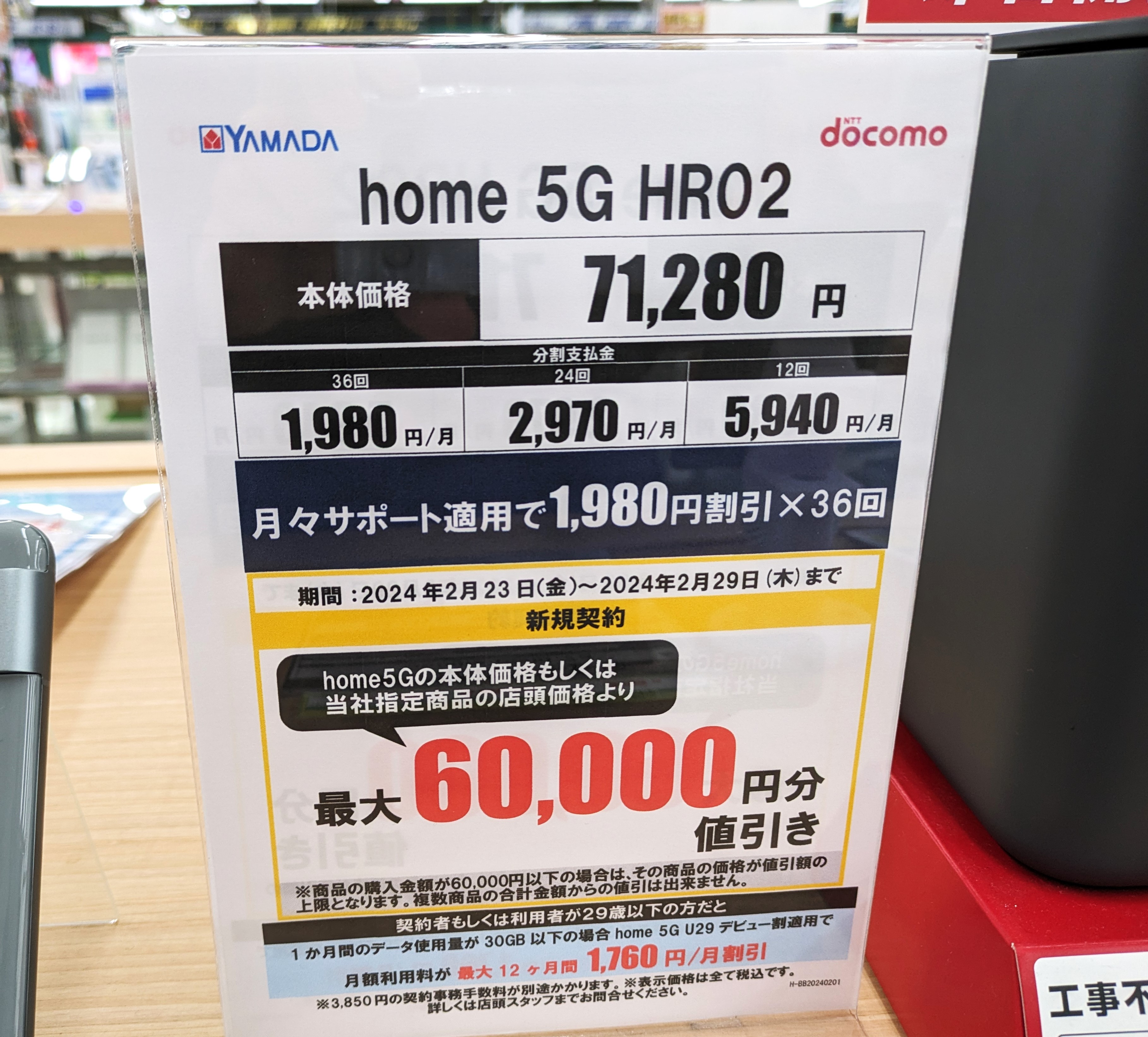 ヤマダ電機では、2023年3月発売のドコモ5Gホームルーター「home 5G HR02(税込71,280円)」が新規契約で60,000円割引となり、一括11,280円(税込)となっています。事務手数料は3,850円(税込)、2/29(木)まで。