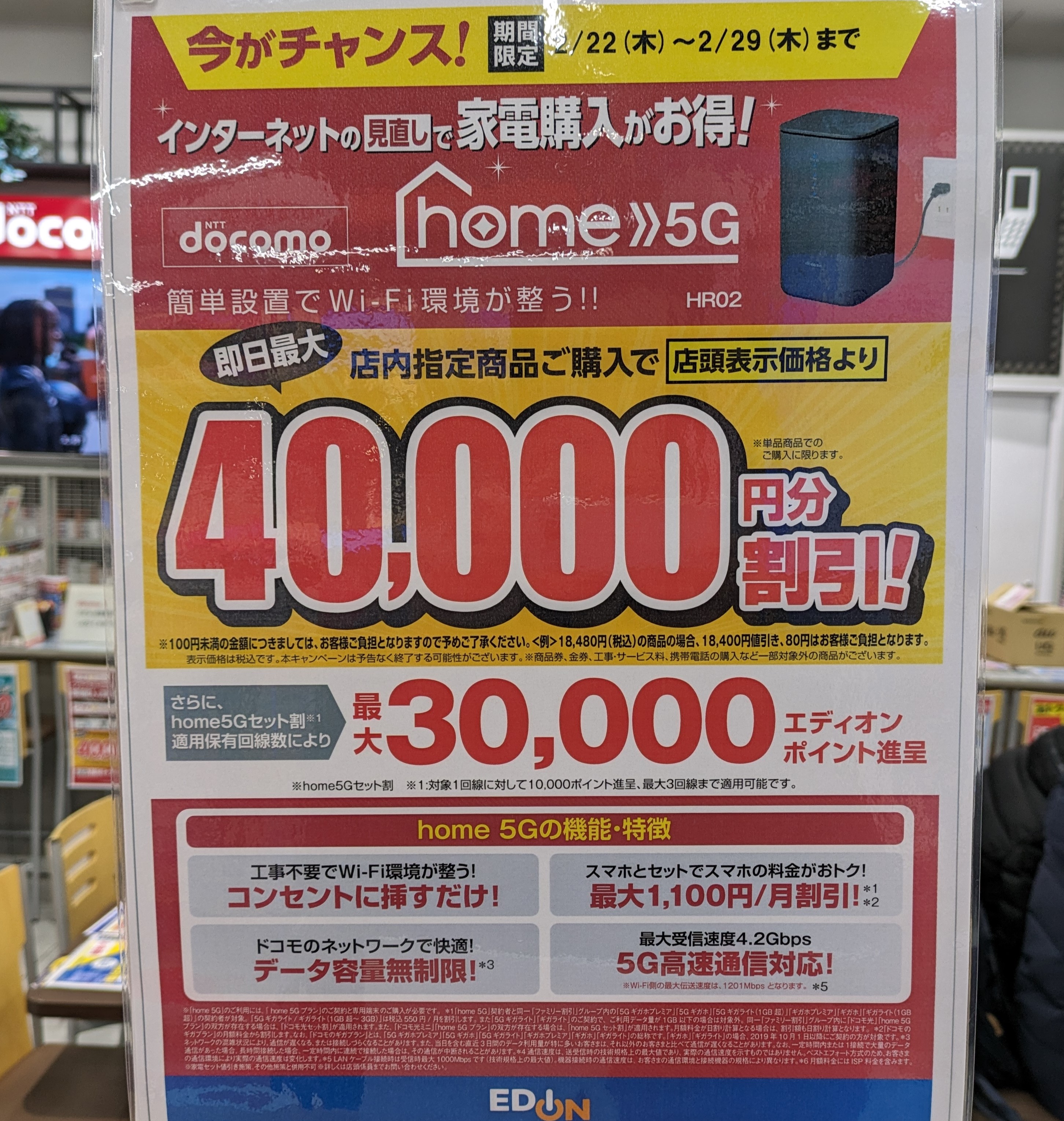 また、エディオンは一括31,280円(税込)に、自身を含めた家族の既存ドコモ回線について「home 5G セット割」を適用で、最大30,000ポイント還元(1回線10,000ポイント×家族3人分)。実質で1,280円ということになります。
