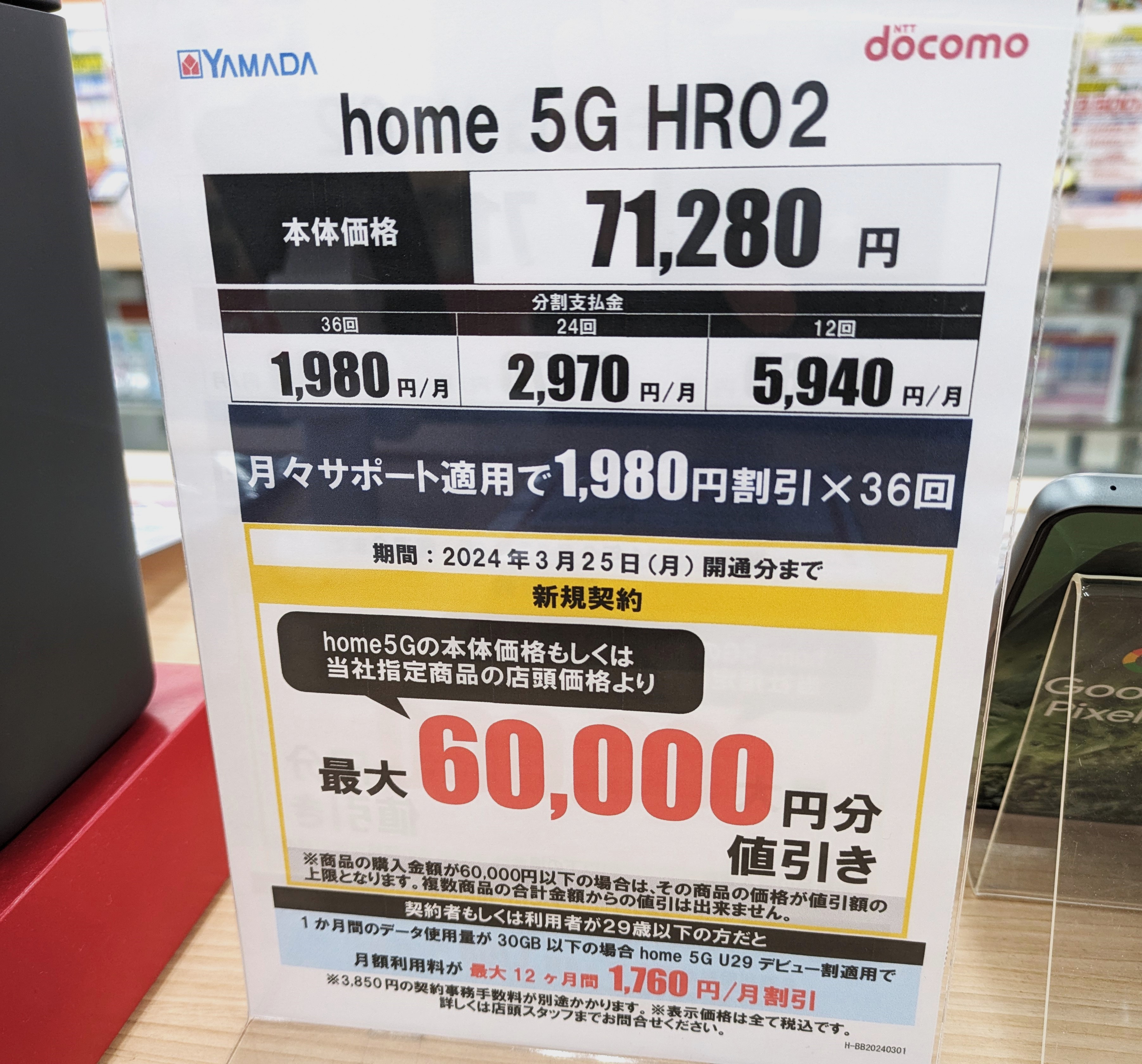 ヤマダ電機では、2023年3月発売のドコモ5Gホームルーター「home 5G HR02(税込71,280円)」が新規契約で60,000円割引となり、一括11,280円(税込)となっています。事務手数料は3,850円(税込)、3/25(月)まで。