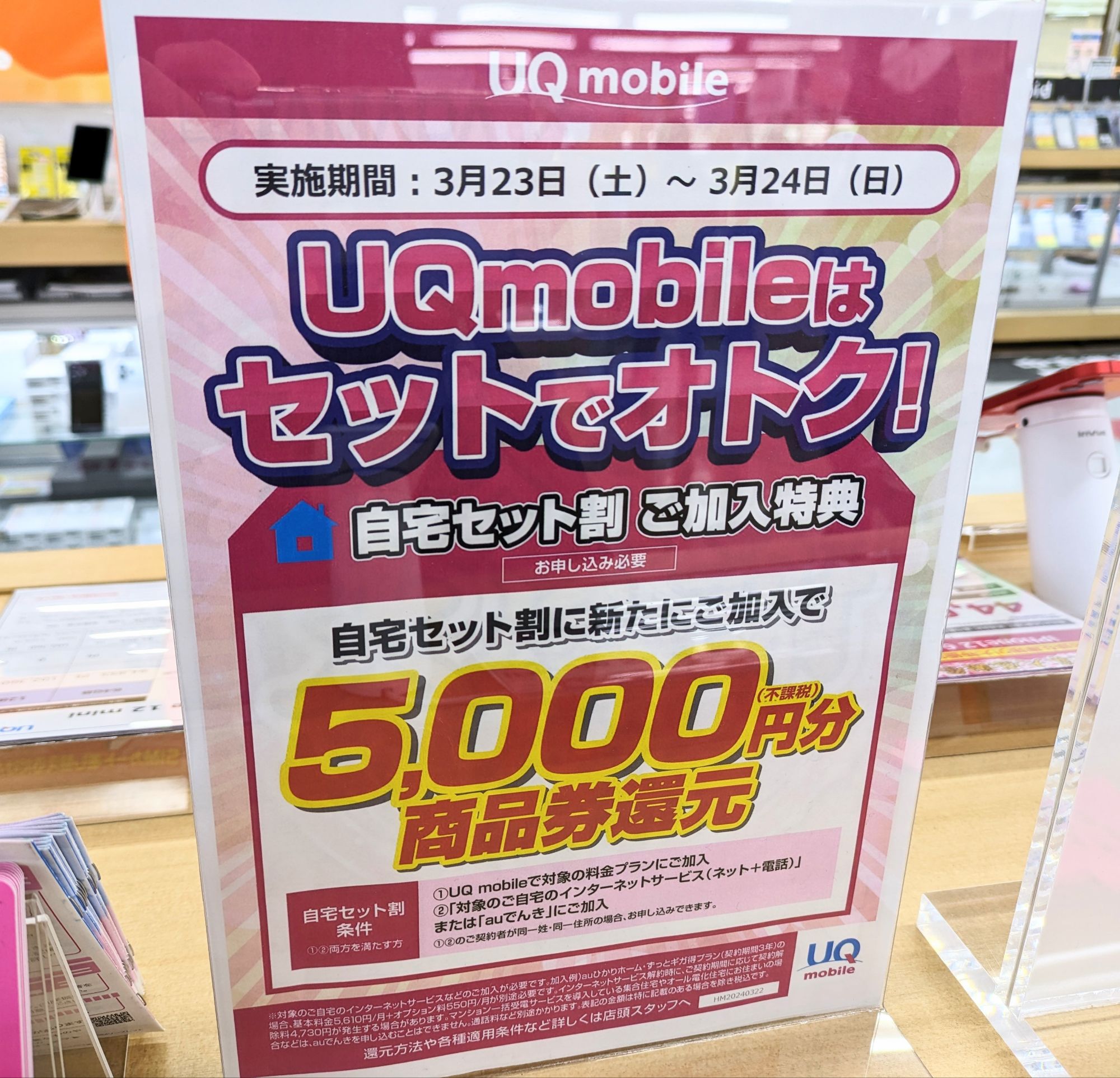 2024年3月23日(土)、ヤマダ電機なんば店では、UQモバイルの「自宅セット割」適用で5,000円のJCB商品券還元キャンペーン実施中です。