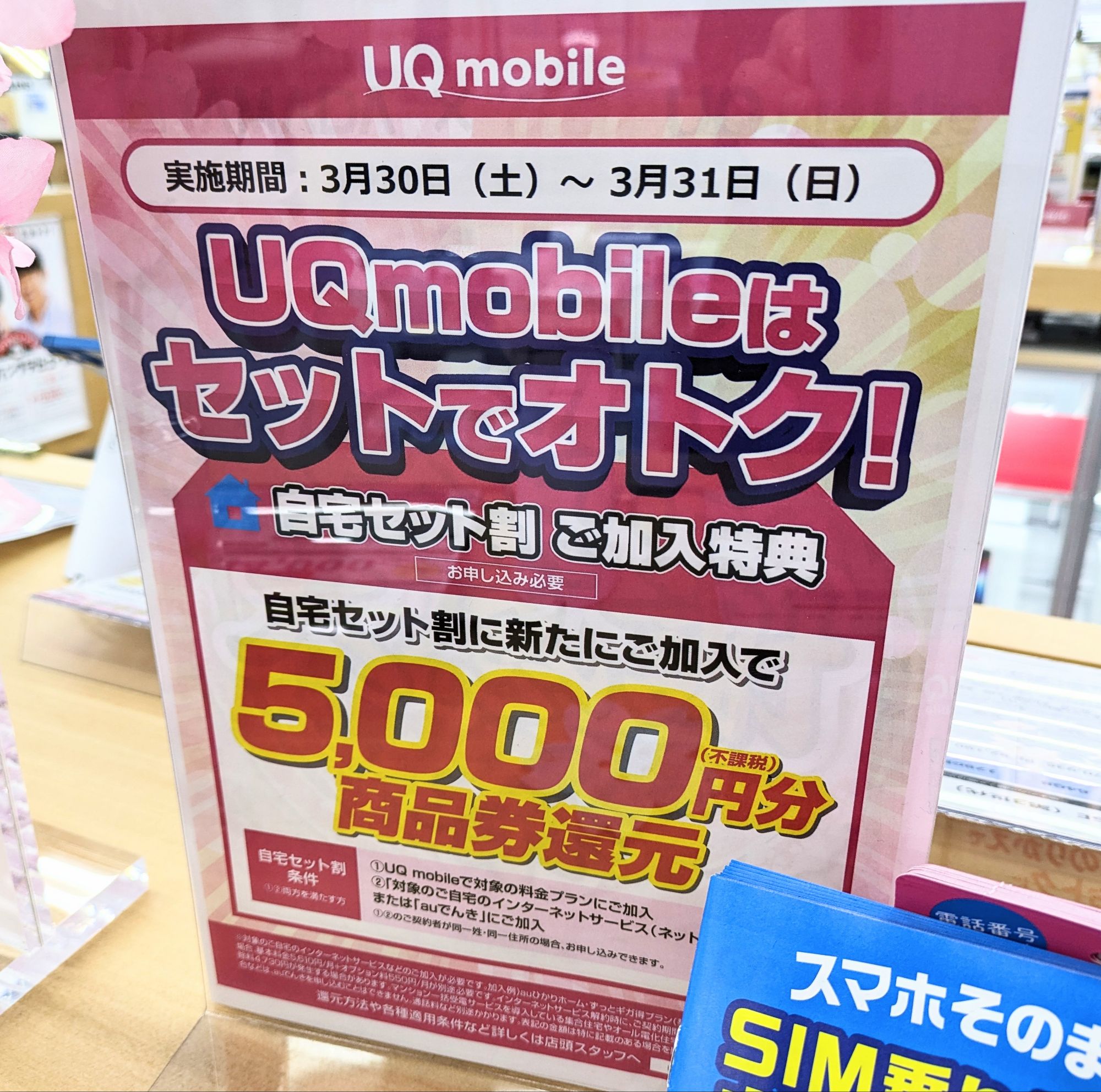 2024年3月30日(土)、ヤマダ電機なんば店では、UQモバイルの「自宅セット割」適用で5,000円のJCB商品券還元キャンペーン実施中です。
