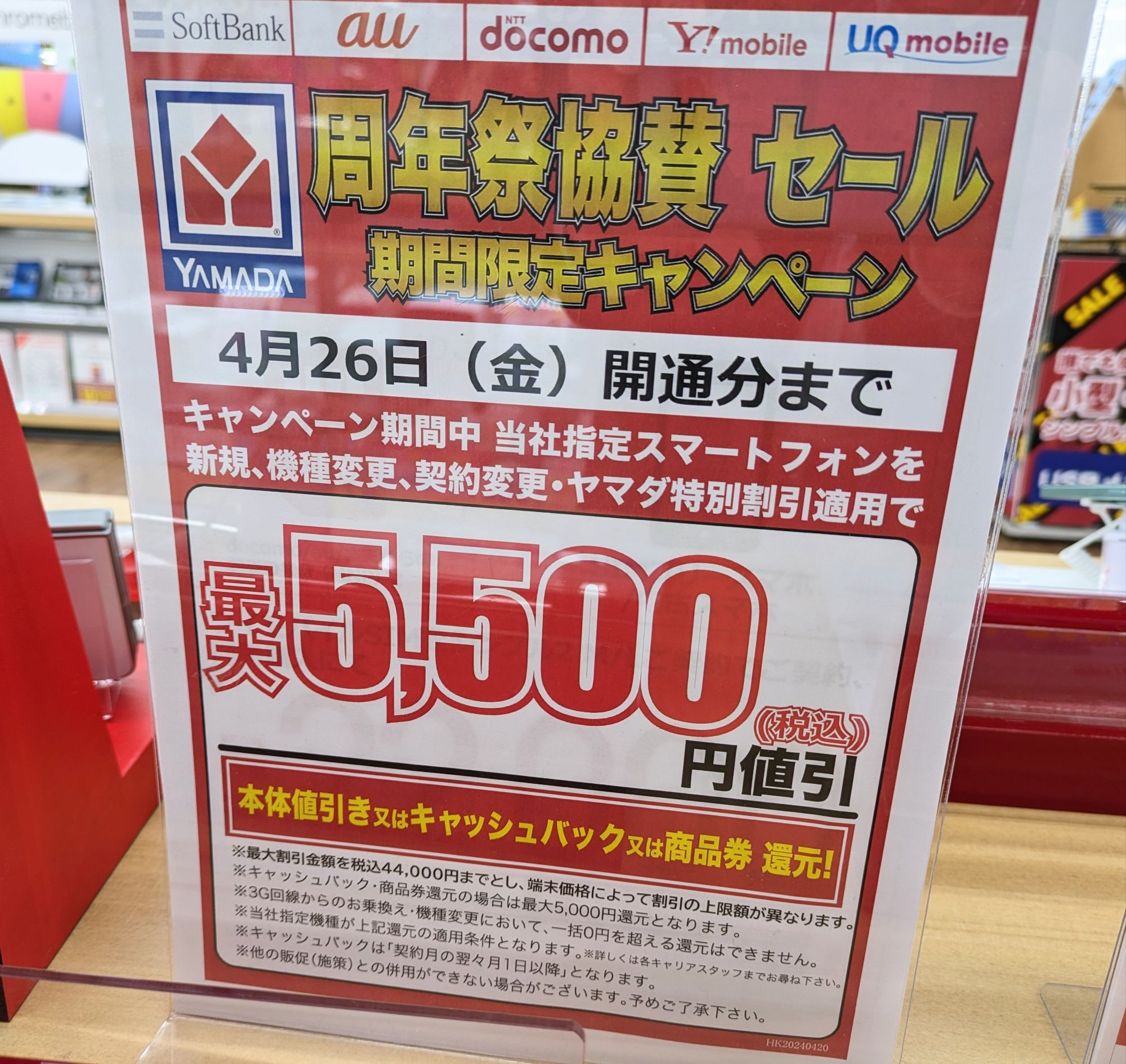 ソフトバンクの「Xperia 10 V(税込31,824円)」などは事務手数料3,850円(税込)分も浮いて、ちょうどいいのではないでしょうか。4/20(土)時点、ショーケースに若干の在庫はありました。