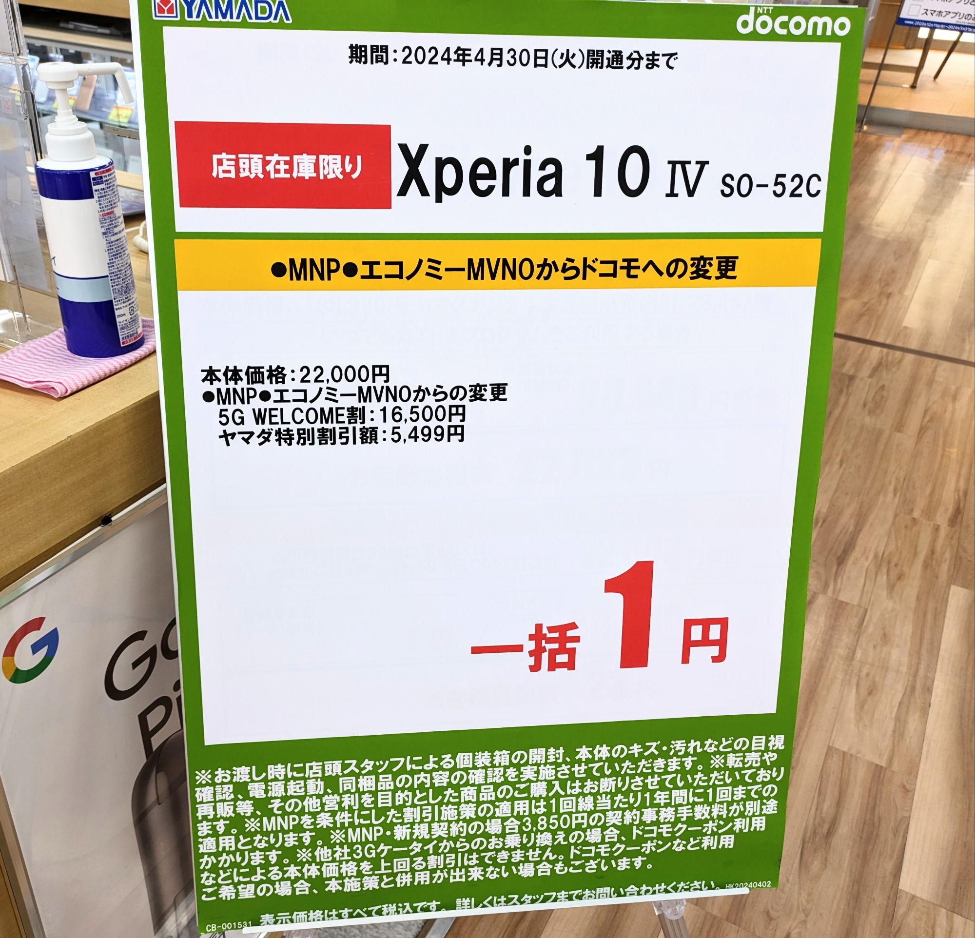 ドコモの「Xperia 10 IV(税込22,000円)」も大ポップを出していましたので、在庫はあるのだと思われます。