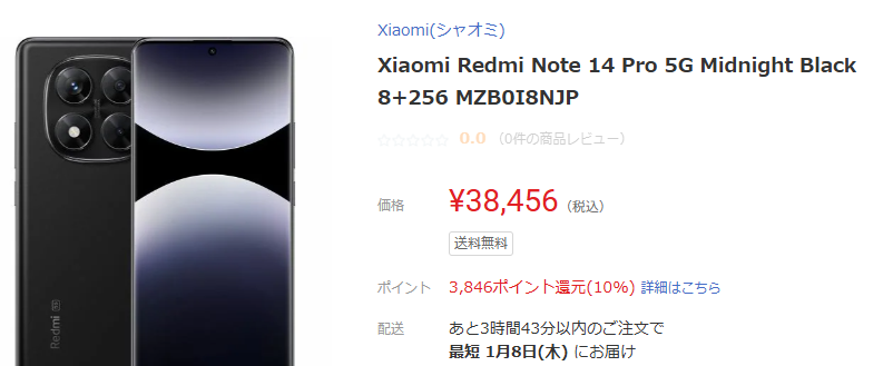 ヤマダウェブコムでは、2025年3月発売の「Redmi Note 14 Pro 5G」が38,456円(税込)に10%ポイント還元となっています。ビックカメラ.comもほぼ同額です。