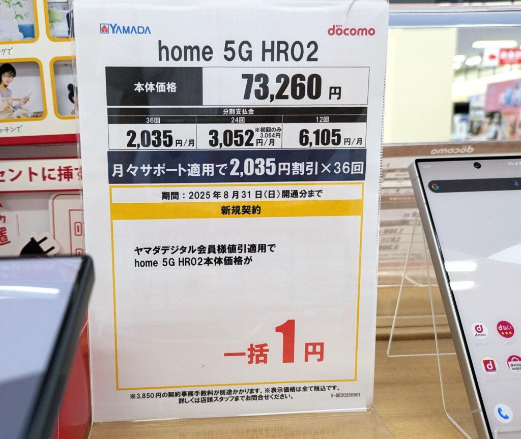 【8/31(日)まで】ドコモ「home 5G HR02」が新規一括1円/事務手数料3,850円/ヤマダデンキ 2025 8/01 ドコモ 2025年8月1日 当ページにはアフィリエイト広告が含まれています。 ヤマダデンキでは、ドコモ「home 5G HR02(税込73,260円)」が新規一括1円となっています。事務手数料は3,850円(税込)、8/31(日)まで。 ドコモ よかったらシェアしてね! URLをコピーしました! URLをコピーしました! この記事を書いた人 Sakura R5G ケータイ特価情報をお届けします。 遠慮なくコメント頂ければ結構ですが、コメントは私が承認するまで表示されませんので、ご注意下さい。 ※2024年7月1日より、参考程度の投稿以外はX(旧ツイッター)に投稿しようと思っています。 人気記事 ワイモバイル 【8/14(木)より】価格(再)更新、ワイモバイル「Google Pixel 8a」が機種変更で49,536円にPayPay還元/事務手数料0円/ヤフーショッピング店 2025年8月14日 ワイモバイル 【2025/11版】ワイモバイル「iPhone 13(認定中古品)」が機種変更一括29,520円/事務手数料3,850円/オンラインストア 2025年11月9日 楽天モバイル 【2025/12版】楽天モバイル「nubia S2R」や「Galaxy A25 5G」がMNP一括1円/事務手数料0円 2025年12月2日 ドコモ 【2025/8版】ahamoへのSIMのみMNPで20,000dポイント(分割進呈)/事務手数料0円/NTTドコモ 2025年8月10日 楽天モバイル 【7/1(火)より】楽天モバイルへのMNPで▲22,000円割引/「Nothing Phone (3a)」が一括32,890円など/事務手数料0円 2025年7月1日 新着記事 【1/10(土)】 Joshin webで「Xiaomi 14T Pro 512GB(パッケージ不良)」が79,800円 【1/15(木)発売】楽天モバイル「Nothing Phone (3a) Lite」が32,890円/はじめて申し込み&MNPで16,000ポイント/2回線目以降は新規で6,000ポイント 【1/13(火)まで】UQモバイル「自宅セット割」適用で10,000ポイント追加還元/ビックカメラ コメント コメントする コメントをキャンセルコメント ※ 名前 メール サイト 新しいコメントをメールで通知 新しい投稿をメールで受け取る