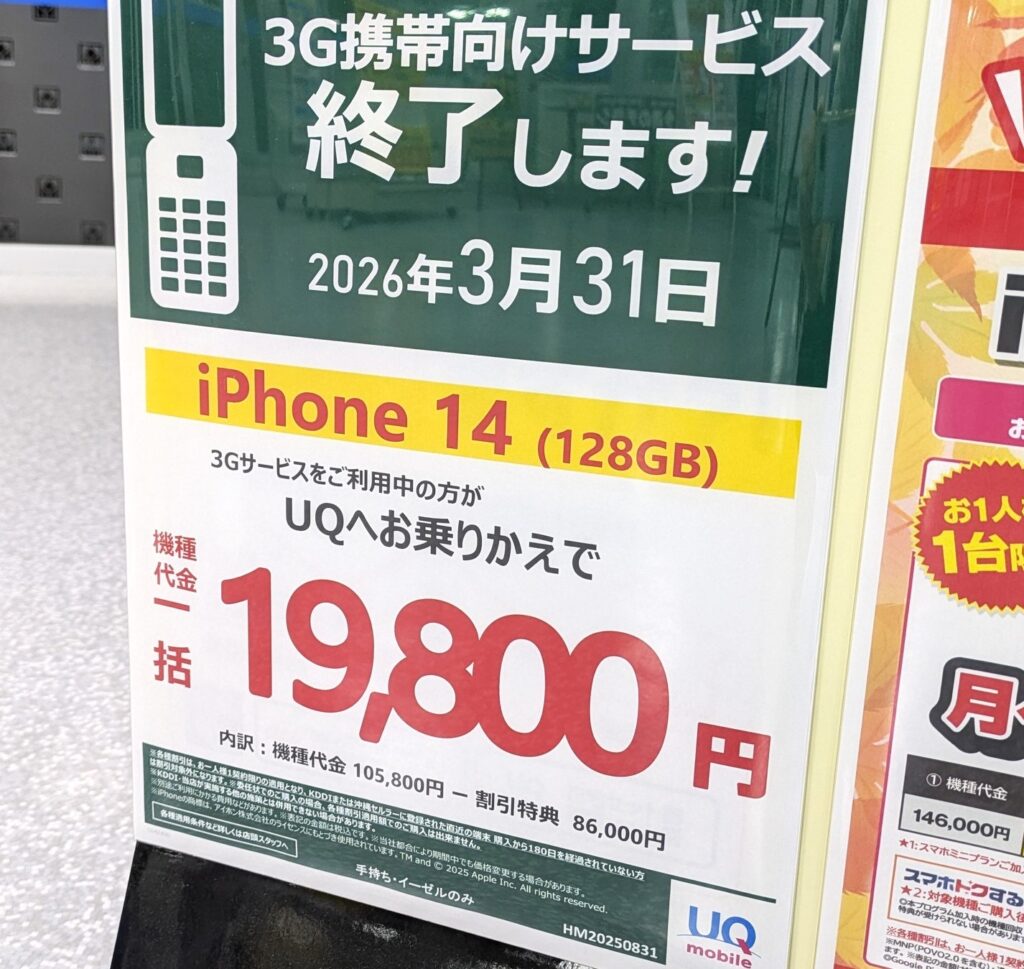 ヤマダデンキでは、UQモバイル「iPhone 14 128GB(税込105,800円)」が、他社3GからのMNPで一括19,800円(税込)となっています。