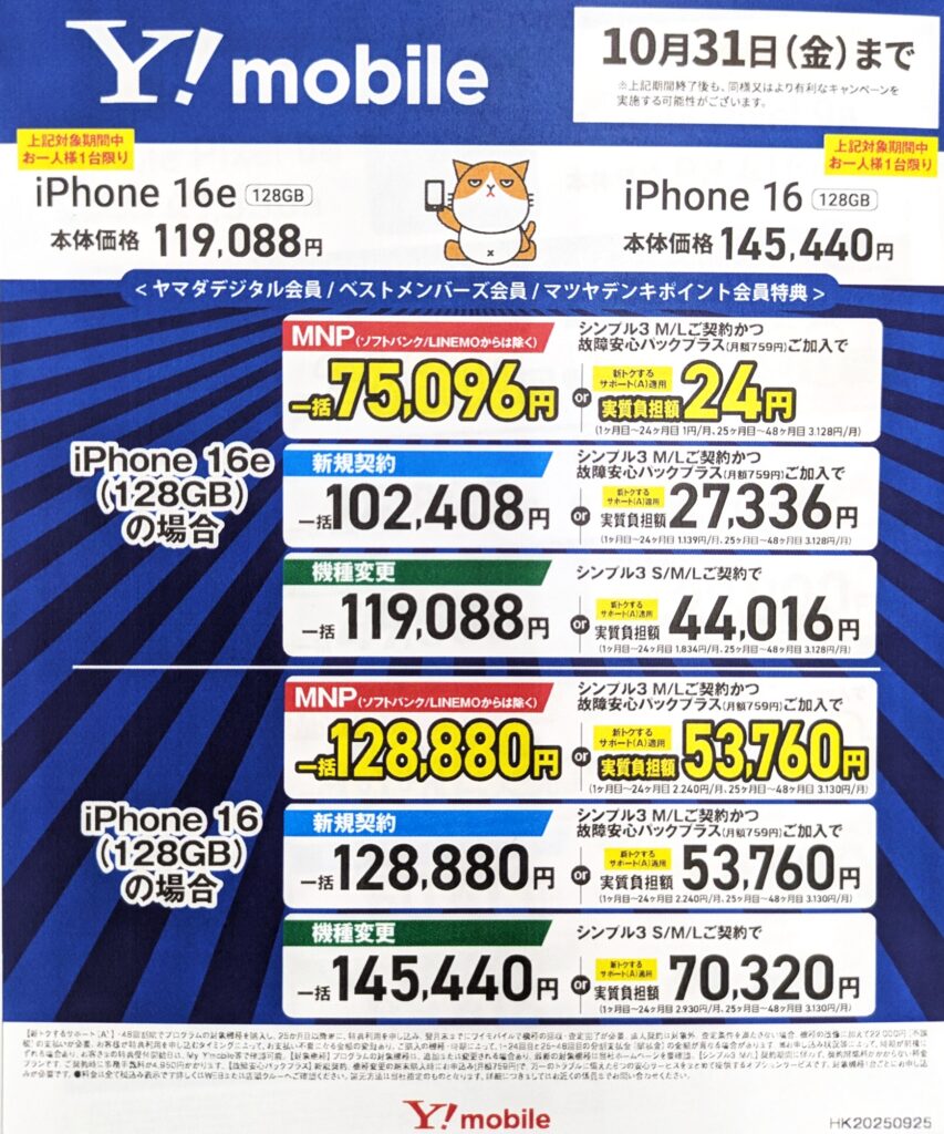 ヤマダデンキでは、引き続き2025年2月発売のワイモバイル「iPhone 16e(税込119,088円)」がMNPで▲43,992円割引の、一括75,096円(税込)となっています。