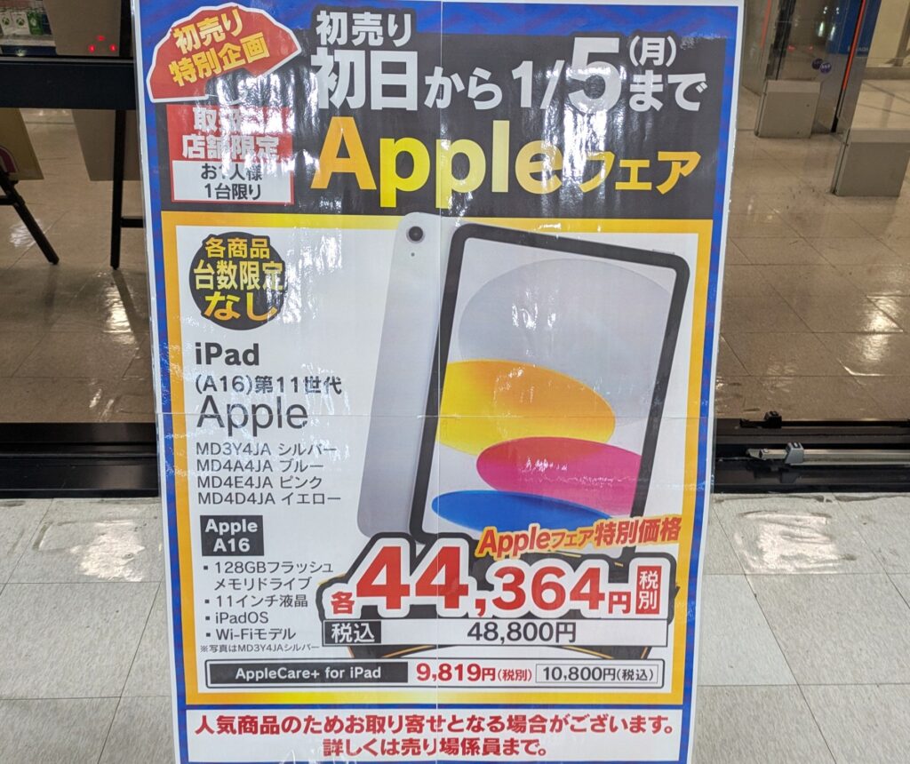 ヤマダデンキでは、2025年3月発売の「iPad 11インチ (A16) Wi-Fi 128GB」が48,800円(税込)となっています。1/5(月)まで。