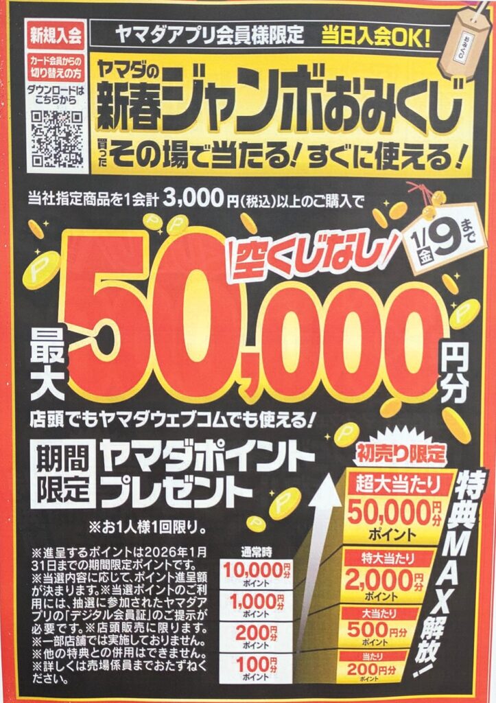 ヤマダデンキの初売りは1/2(金)からで、イオン等のショッピングモール内など一部店舗は元日(木)です。