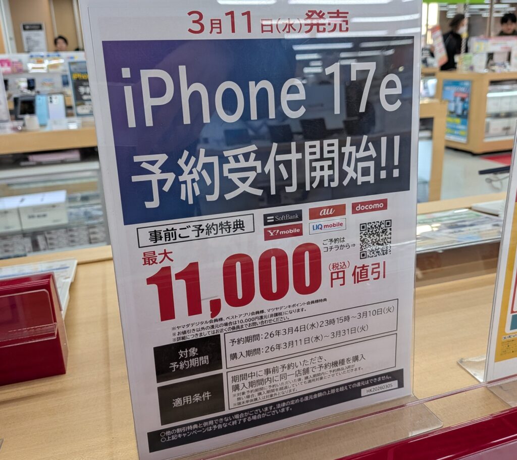 ヤマダデンキでは3/11(水)発売の「iPhone 17e」の事前予約で11,000円割引(若しくは10,000ポイント還元)となっています。但し、ポップに記載のとおり、法律の定める還元金額の上限を超えての還元は不可になります。