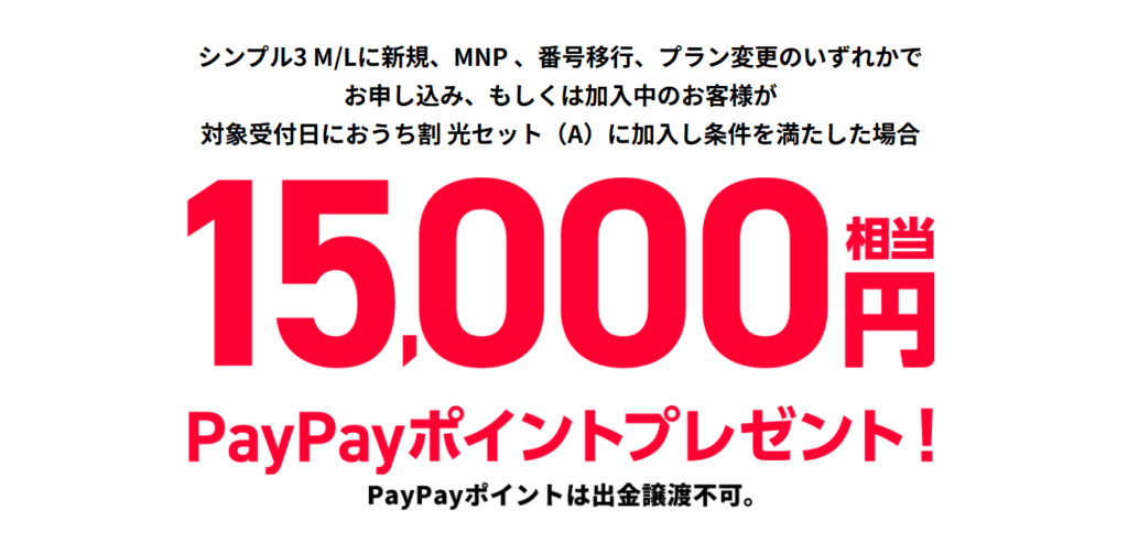 引き続き、「おうち割光セット(A)」適用で15,000円相当のPayPayポイント還元です。