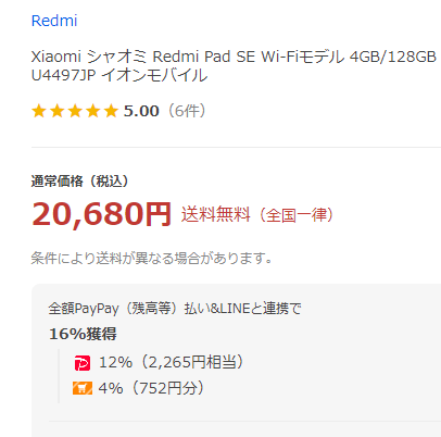 2024年3月15日(金)、イオンモバイルオンラインショップでは、Xiaomi「Redmi Pad SE Wi-Fiモデル(4GB/128GB)」が20,680円(税込)で入荷しています。