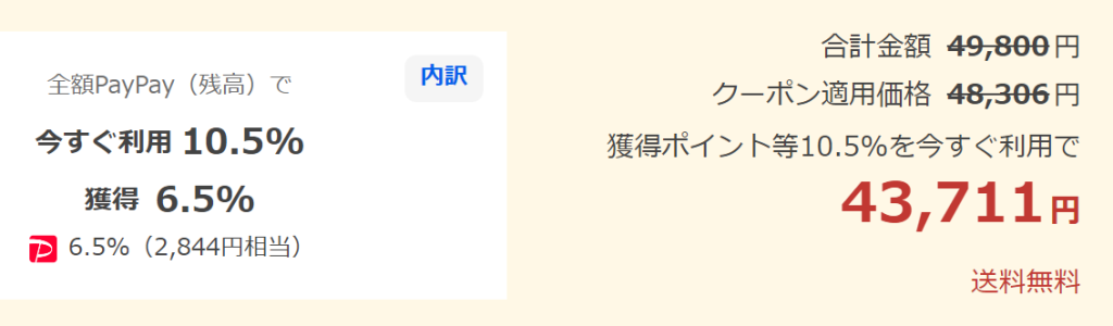 さらに約2,844円相当のPayPayポイント還元。クーポン取得、及び自身のPayPayポイント還元額はYahoo!店にログインの上(まとめてエントリーはこちら)、ご確認下さい。