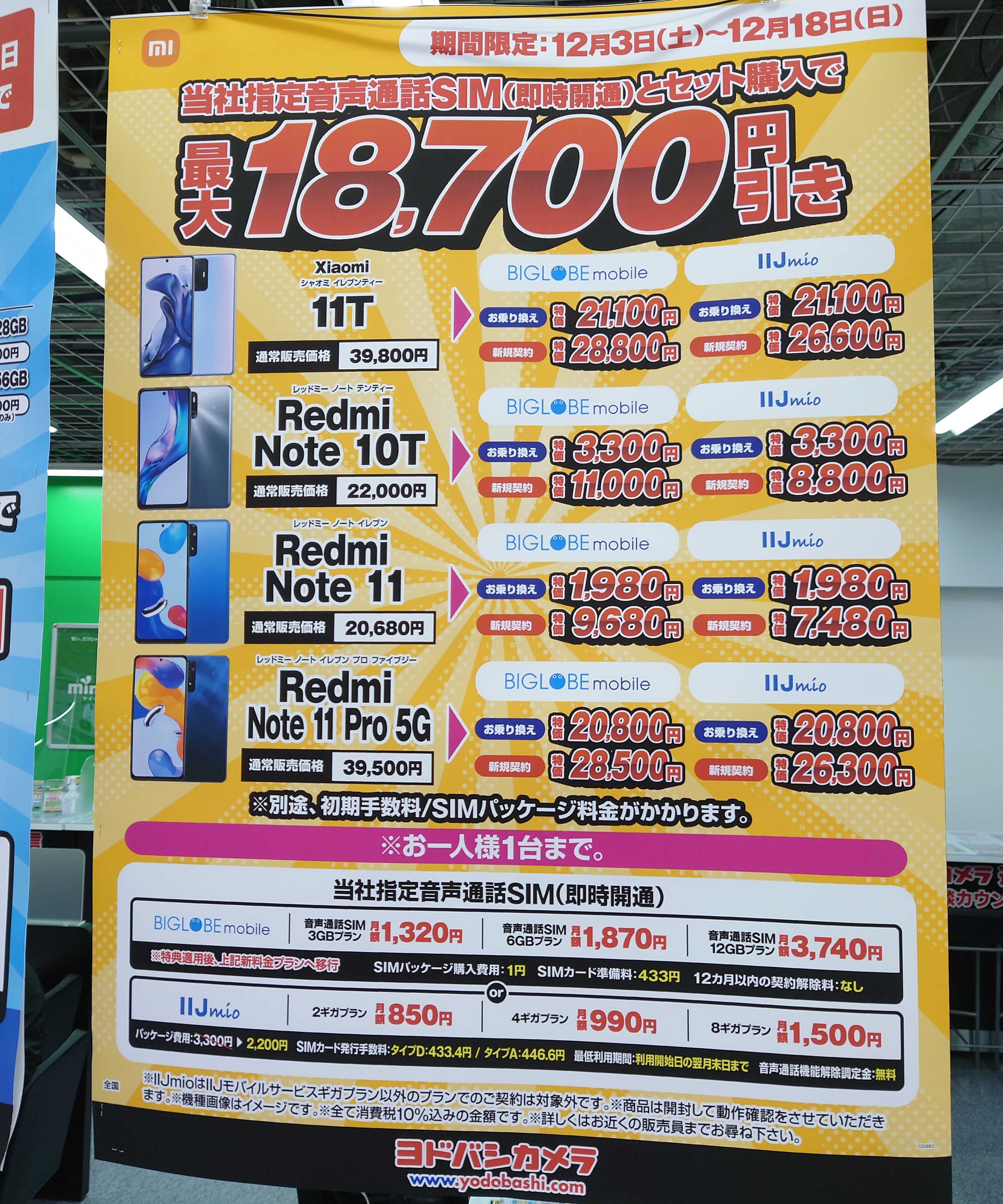 ヨドバシカメラではIIJmioへのMNPで「Redmi Note 11 Pro 5G(税込39,500円)」が20,800円(税込)等となっています。10%ポイント還元付。