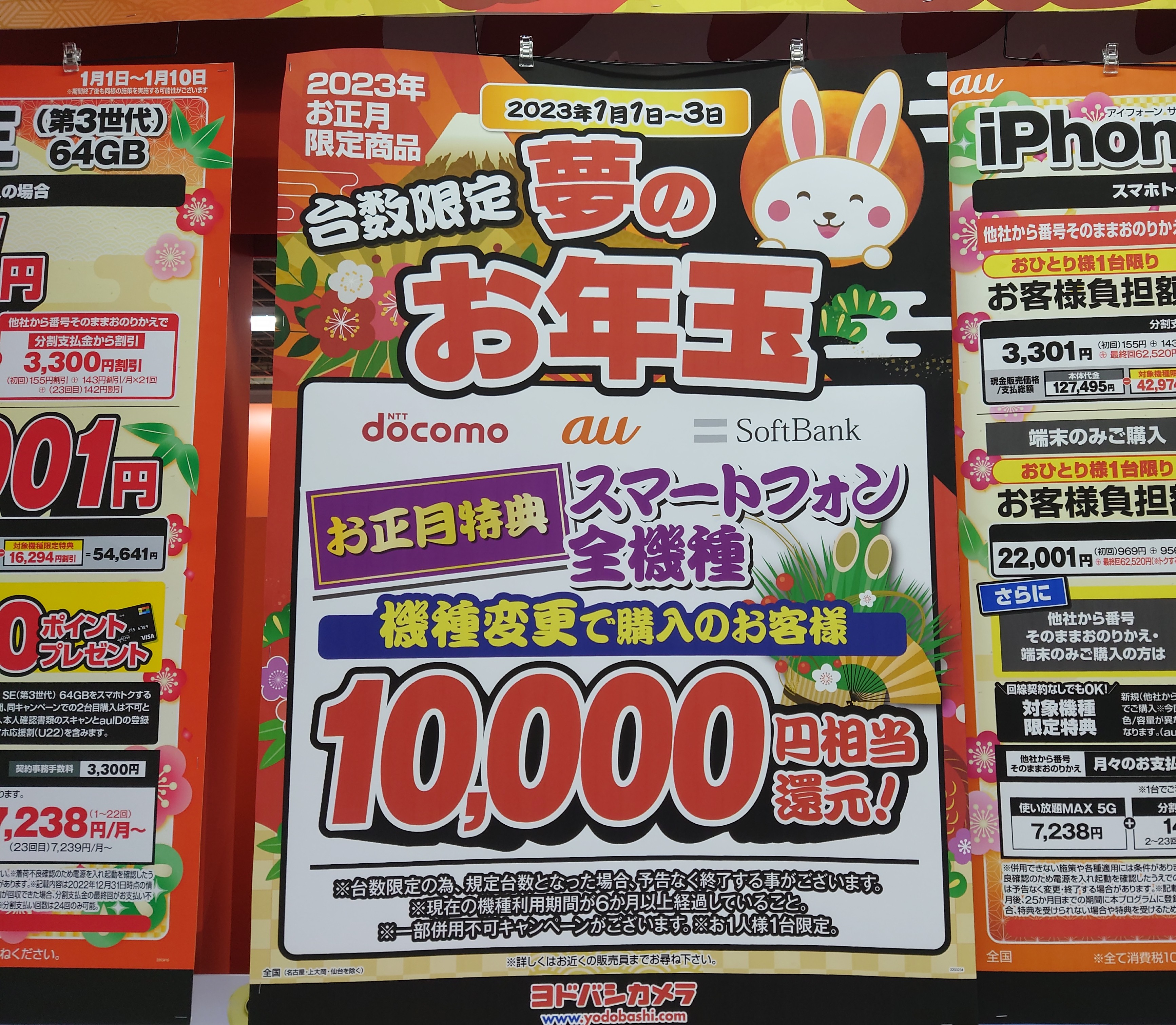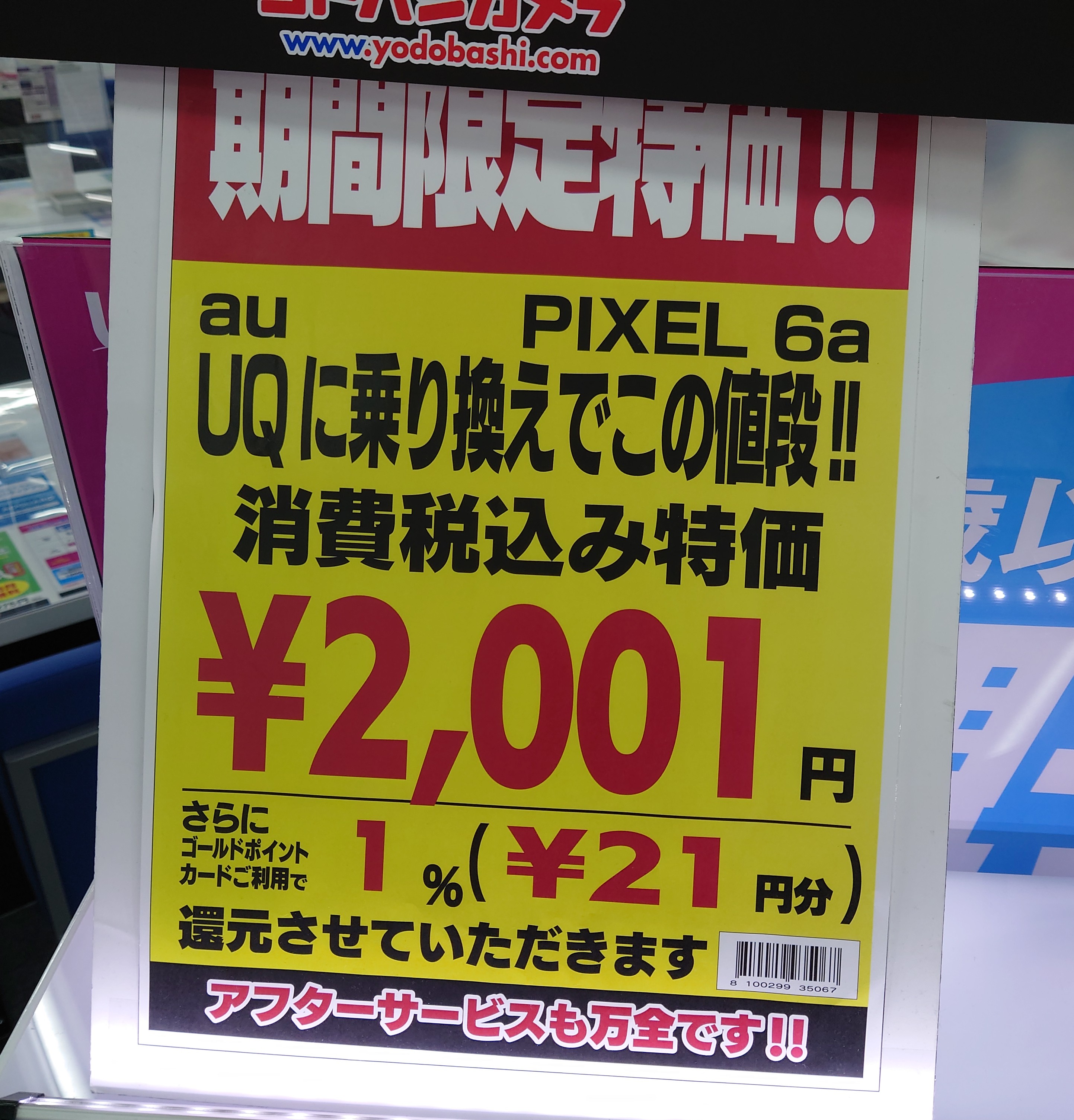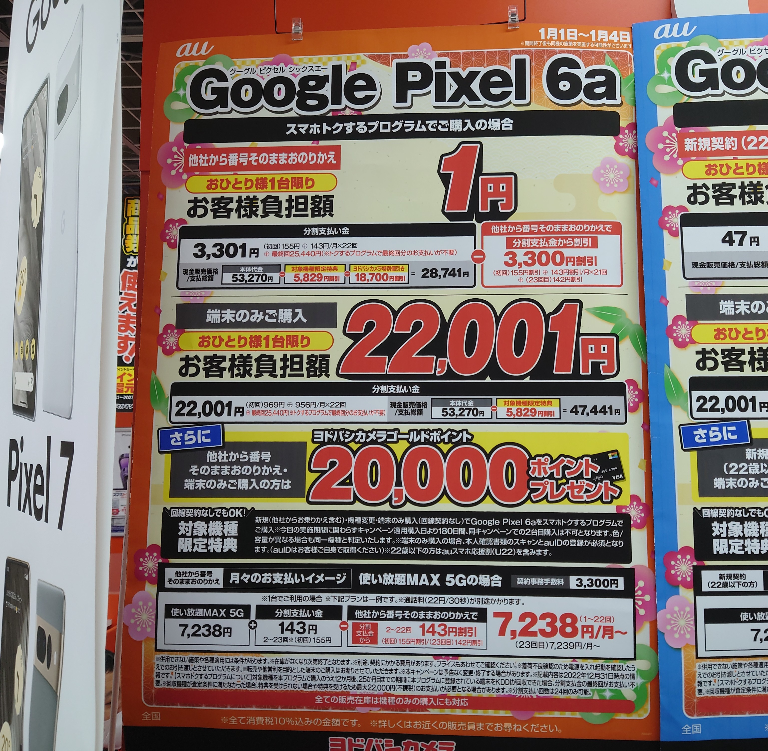 2023年1月1日(元旦)、ヨドバシカメラ梅田では、au「Google Pixel 6a(税込53,270円)」がMNP一括1円(税込)となっています。