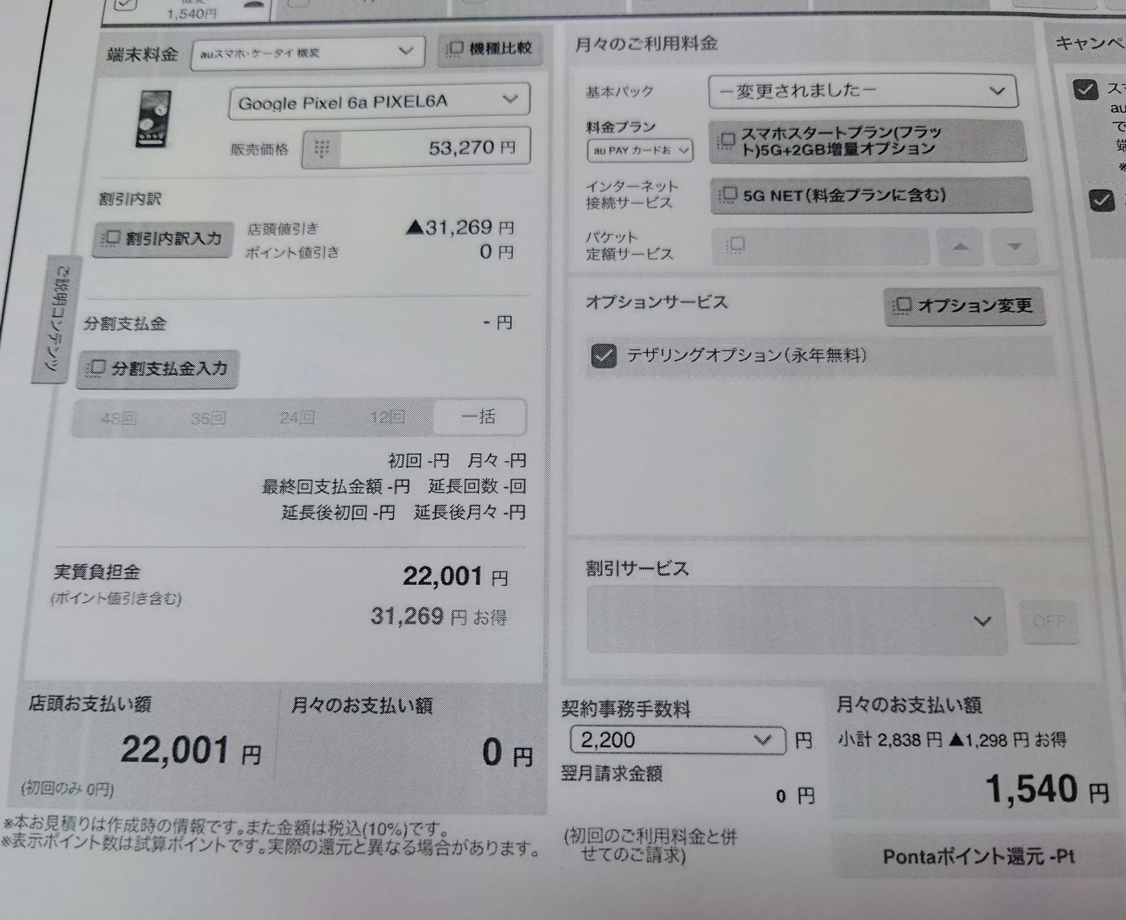 機種変更一括22,001円(税込)に、1万ポイント還元で間違いありませんでした。5Gスマホスタートプラン継続可。事務手数料は2,200円(税込)。