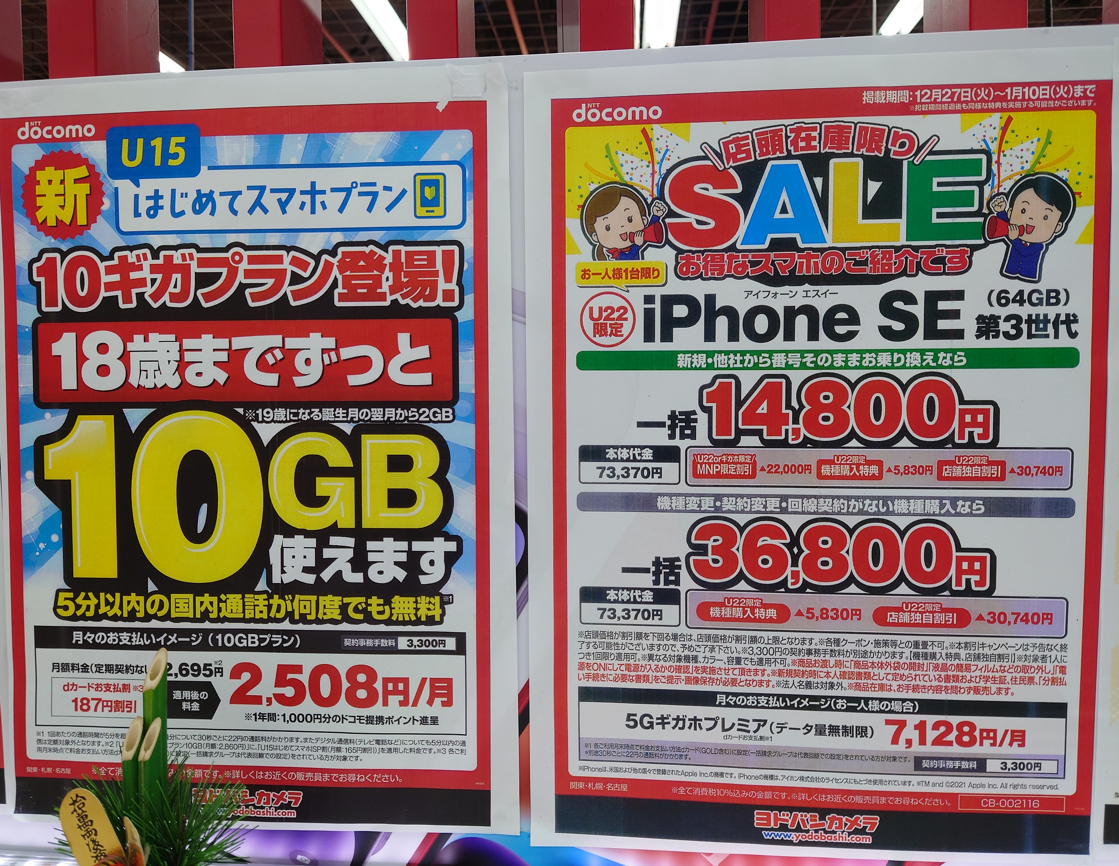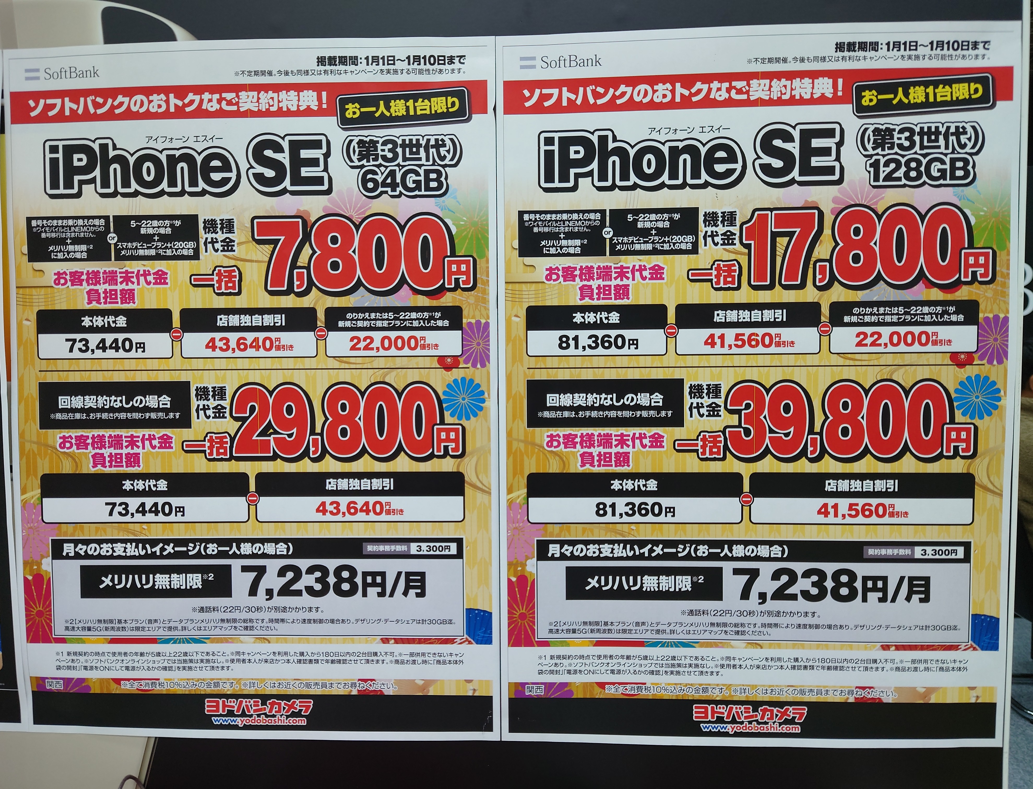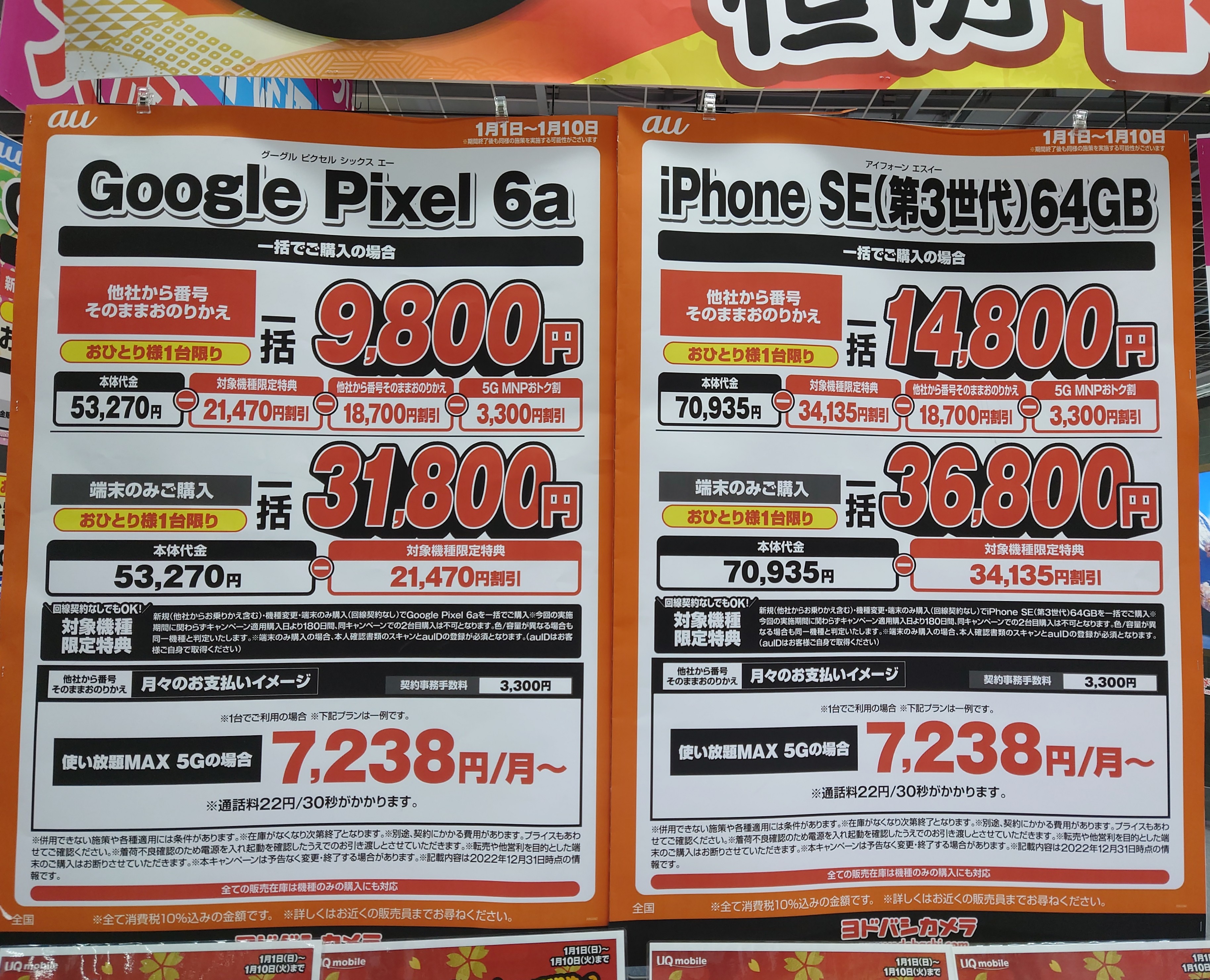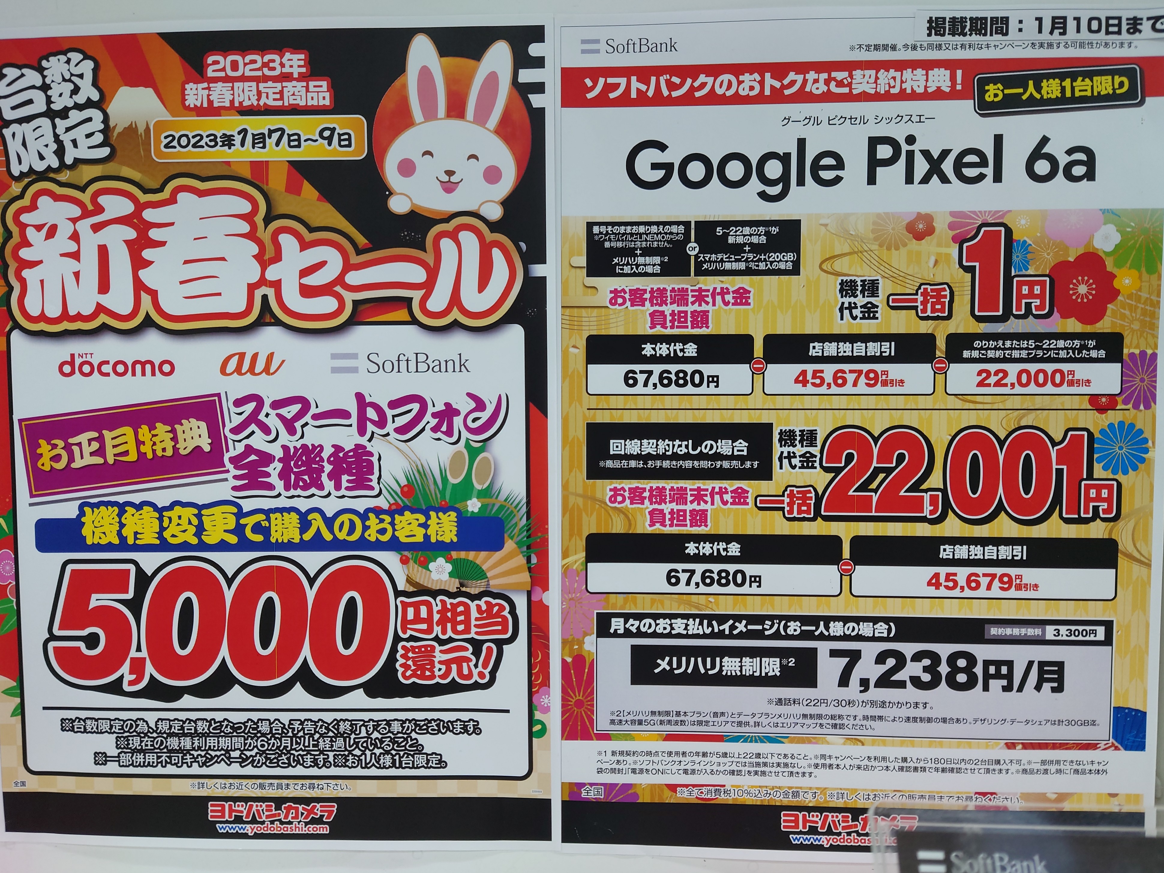 2023年1月7日(土)、ヨドバシカメラ梅田では、3キャリア共通施策で、機種変更5,000円還元実施中。6ヵ月以上利用者限定。1/9(月)まで。
