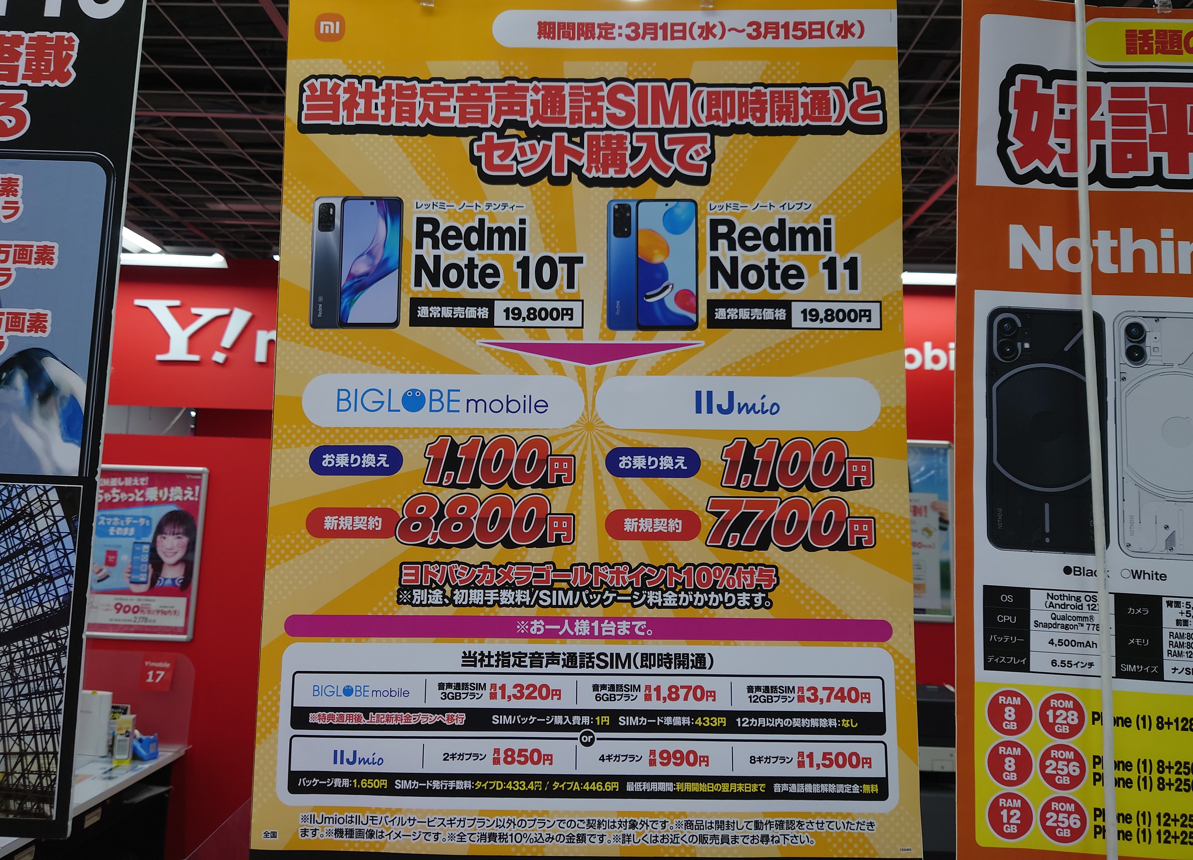 また、SIMフリーでは「Redmi Note 10T」や「Redmi Note 11」が、IIJmioやビッグローブへのMNPで一括1,100円(税込)の在庫処分となっています。事務手数料はIIJmio1,650円(税込)、ビッグローブ1円です。