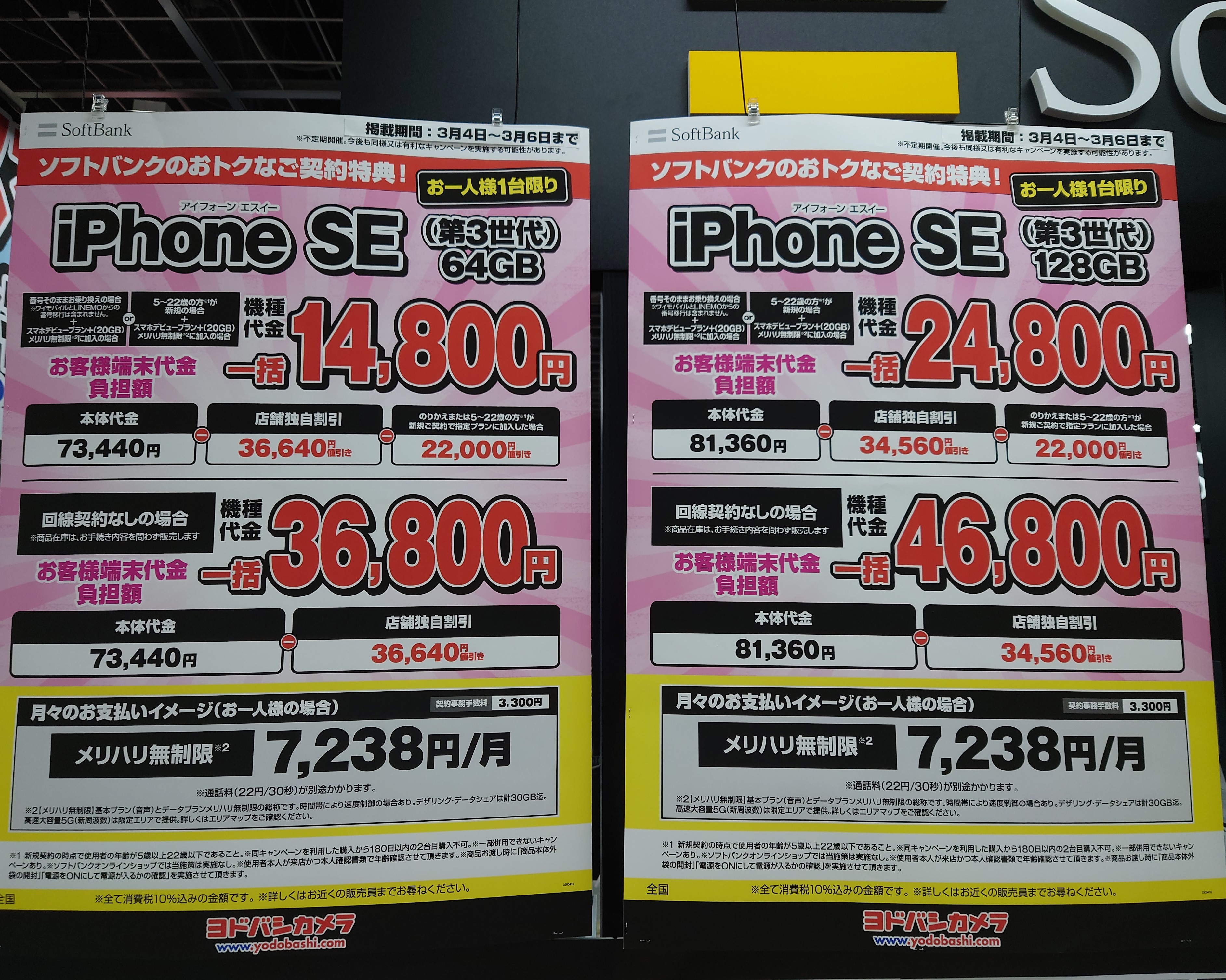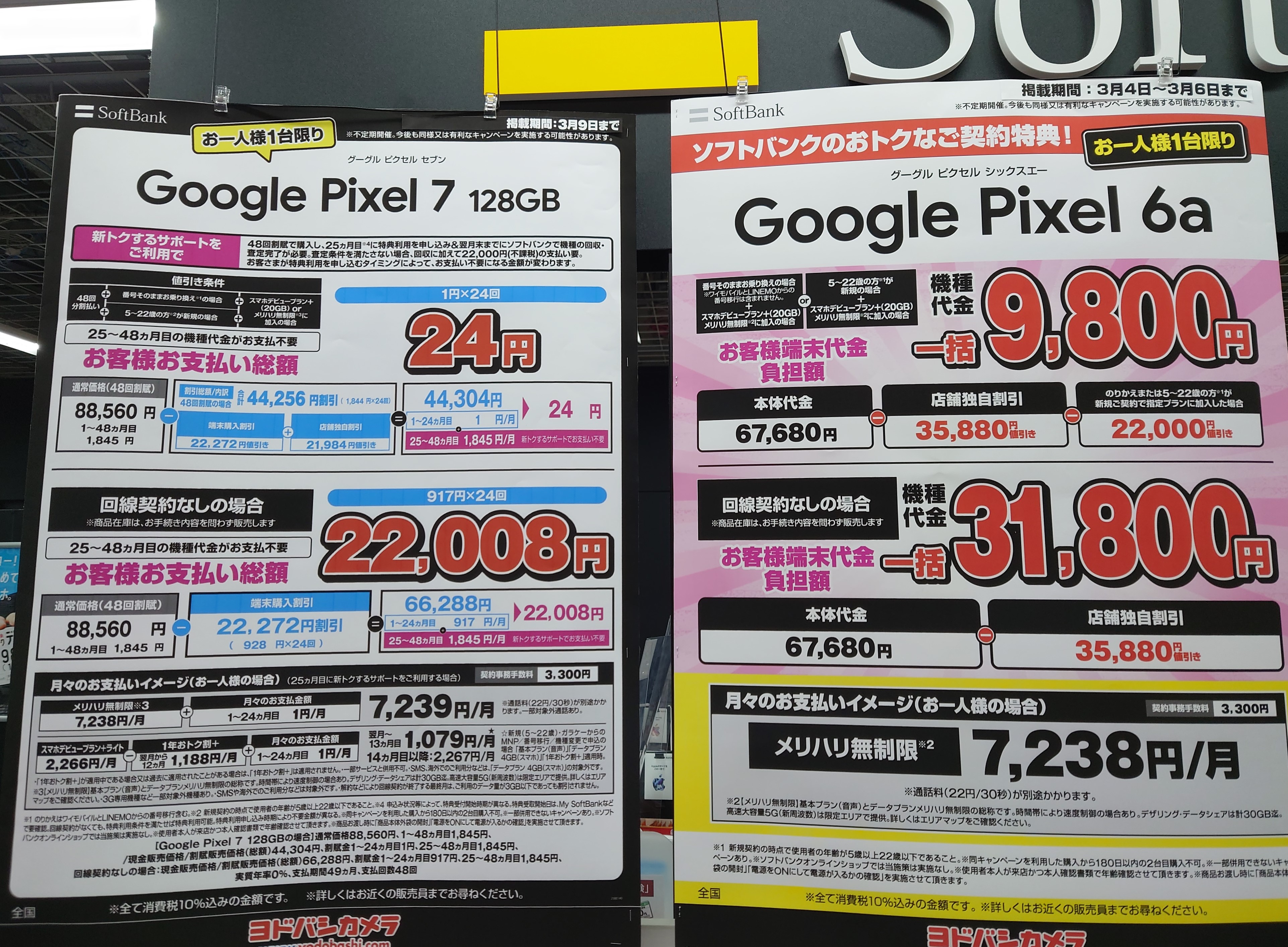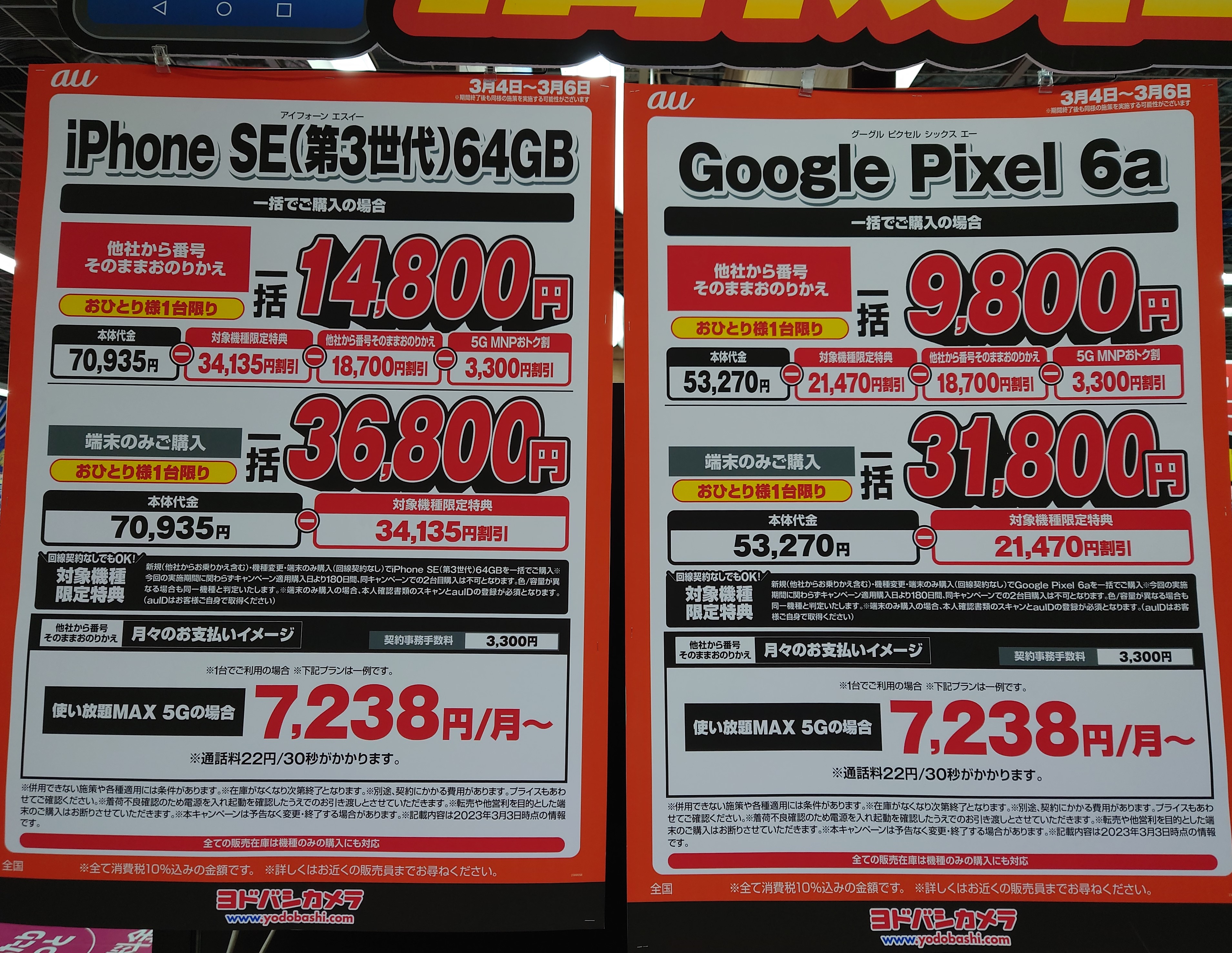 ヨドバシカメラ梅田では、au「Google Pixel 6a(53,270円(税込)」がMNP一括9,800円(税込)等となっています。3/6(月)まで