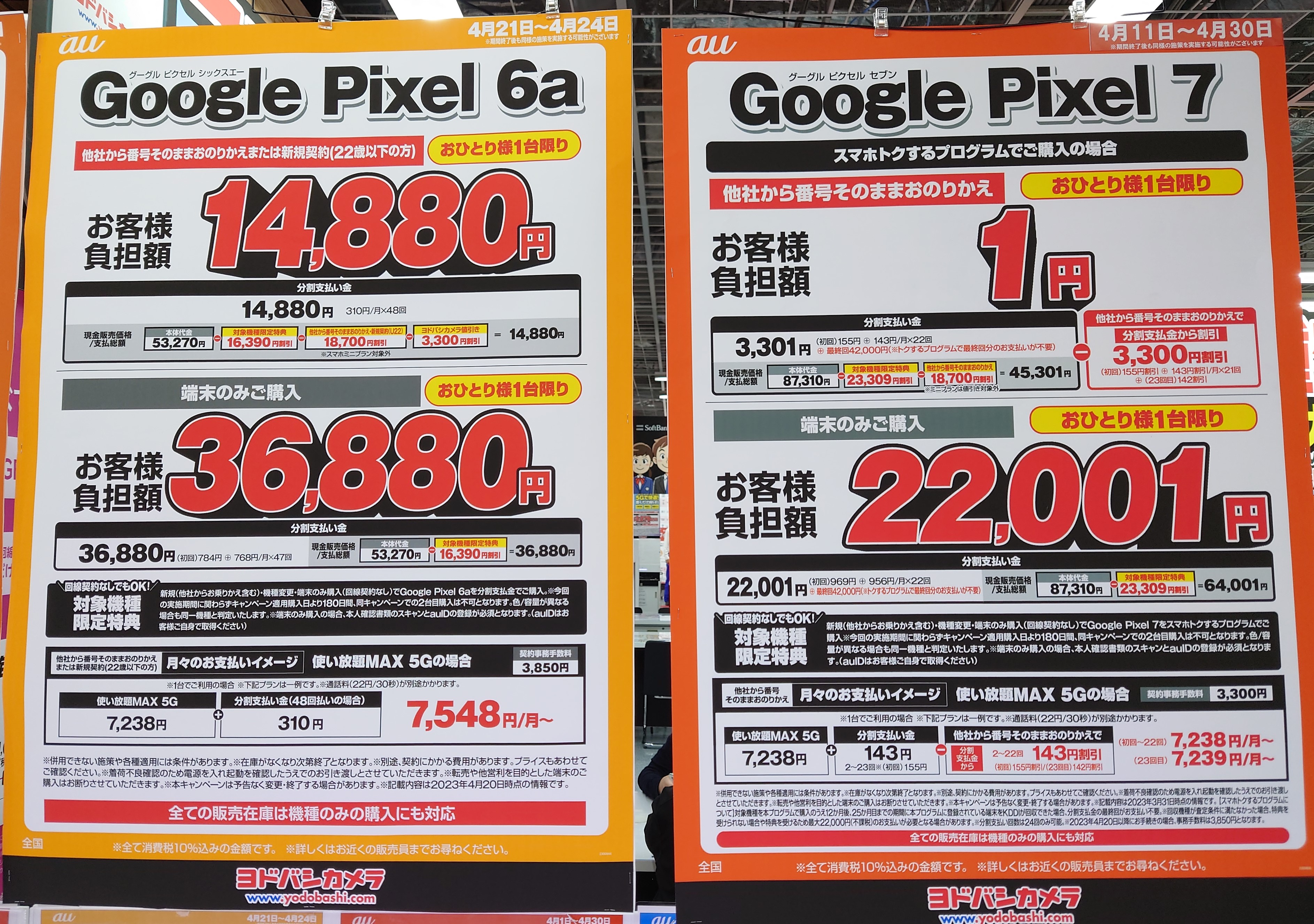 ヨドバシカメラでは、au「Google Pixel 6a(税込53,270円)」がMNP若しくは22歳以下新規の48回分割で総額14,880円(税込)となっています。