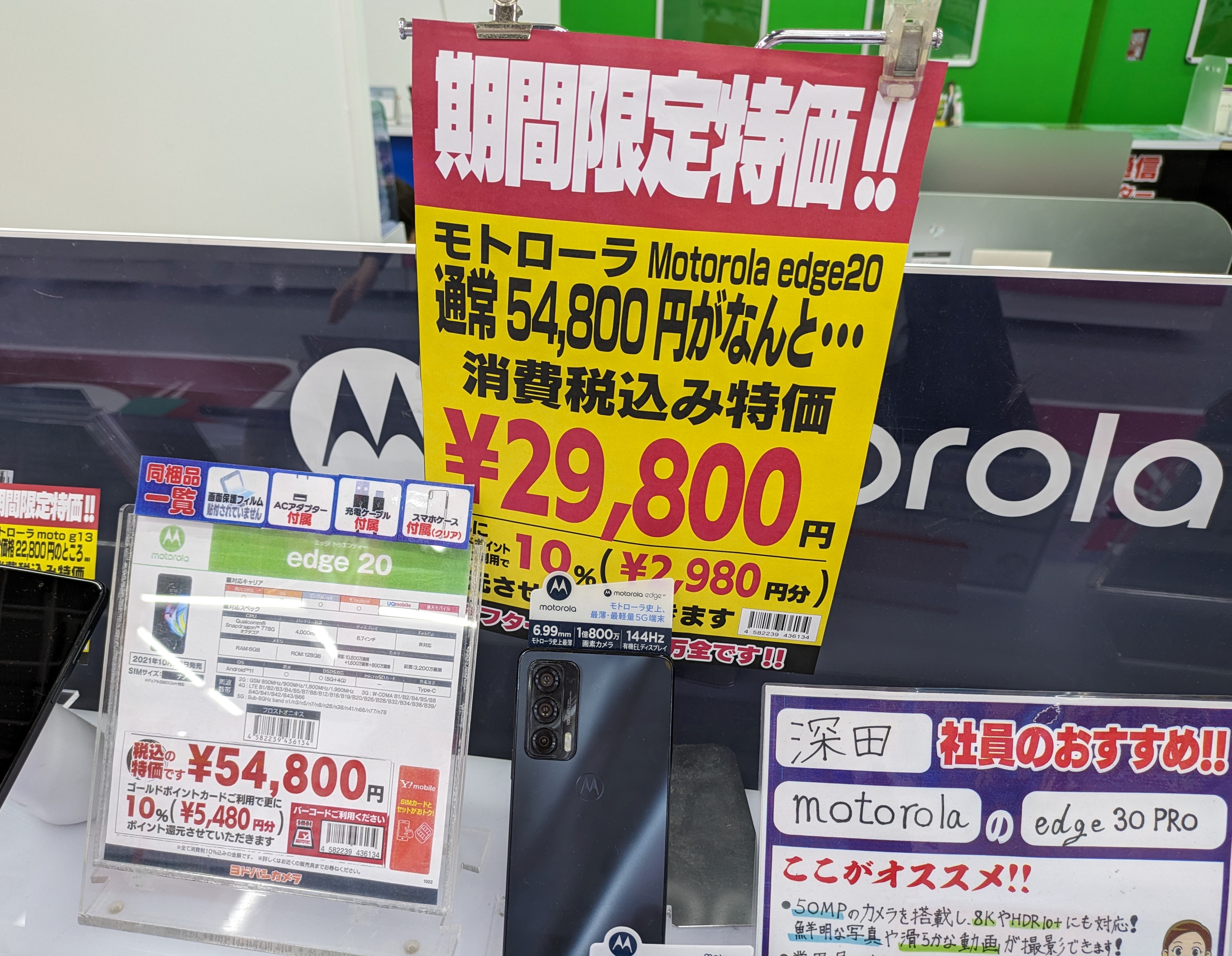 2023年5月20日(土)、ヨドバシカメラ梅田では、2021年10月発売の「motorola edge 20」が単品29,800円(税込)に10%ポイント還元(2,980pt)の処分特価になっています。