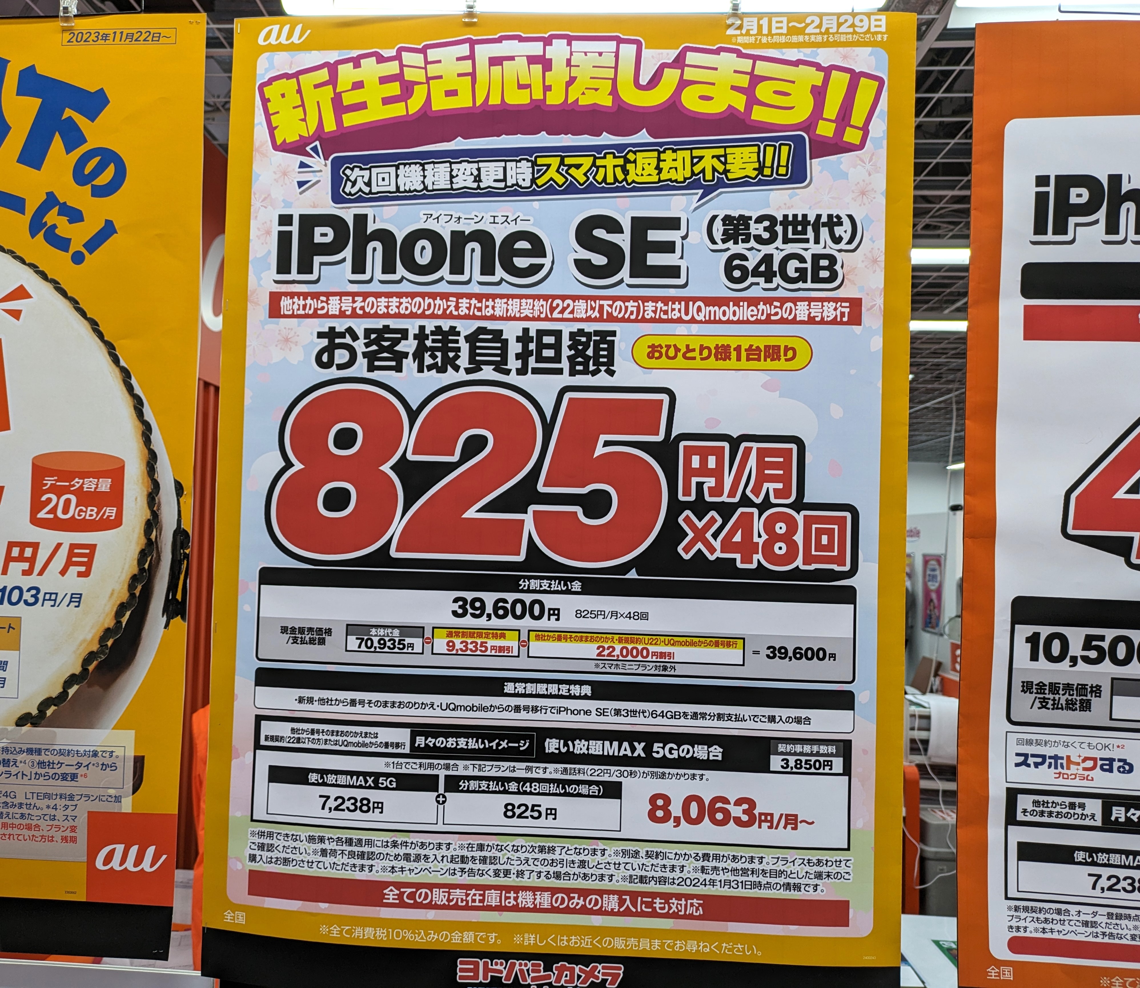 ヨドバシカメラではau「iPhone SE 64GB(税込70,935円)」が、MNP又は22歳以下新規若しくはUQモバイルからの番号移行で▲31,335円割引となり、48回分割総額39,600円(税込)となっています。
