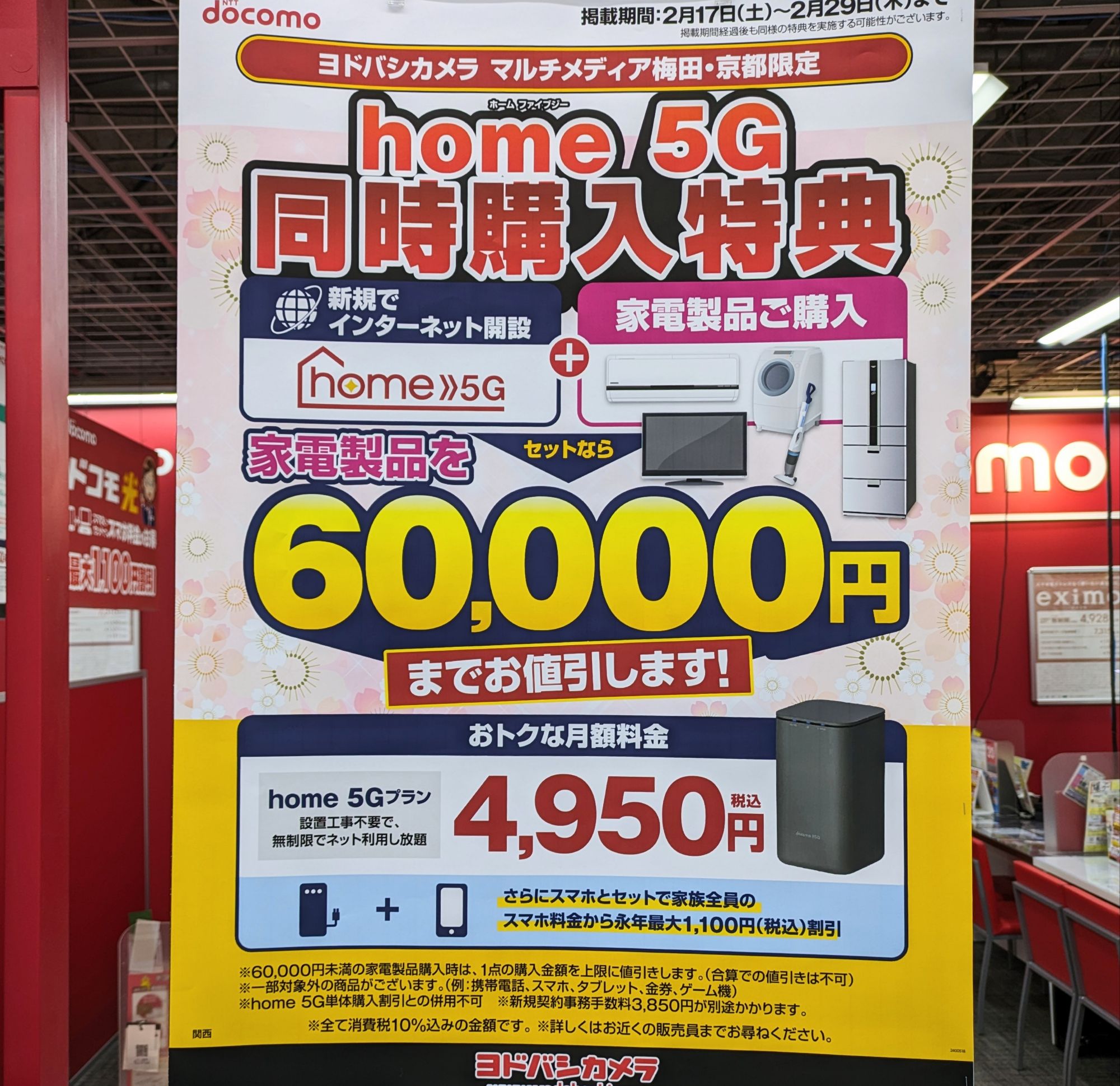 ヨドバシカメラ梅田・京都では、2023年3月発売のドコモ5Gホームルーター「home 5G HR02(税込71,280円)」が新規契約で60,000円割引となり、一括11,280円(税込)となっています。事務手数料は3,850円(税込)、2/29(木)まで。