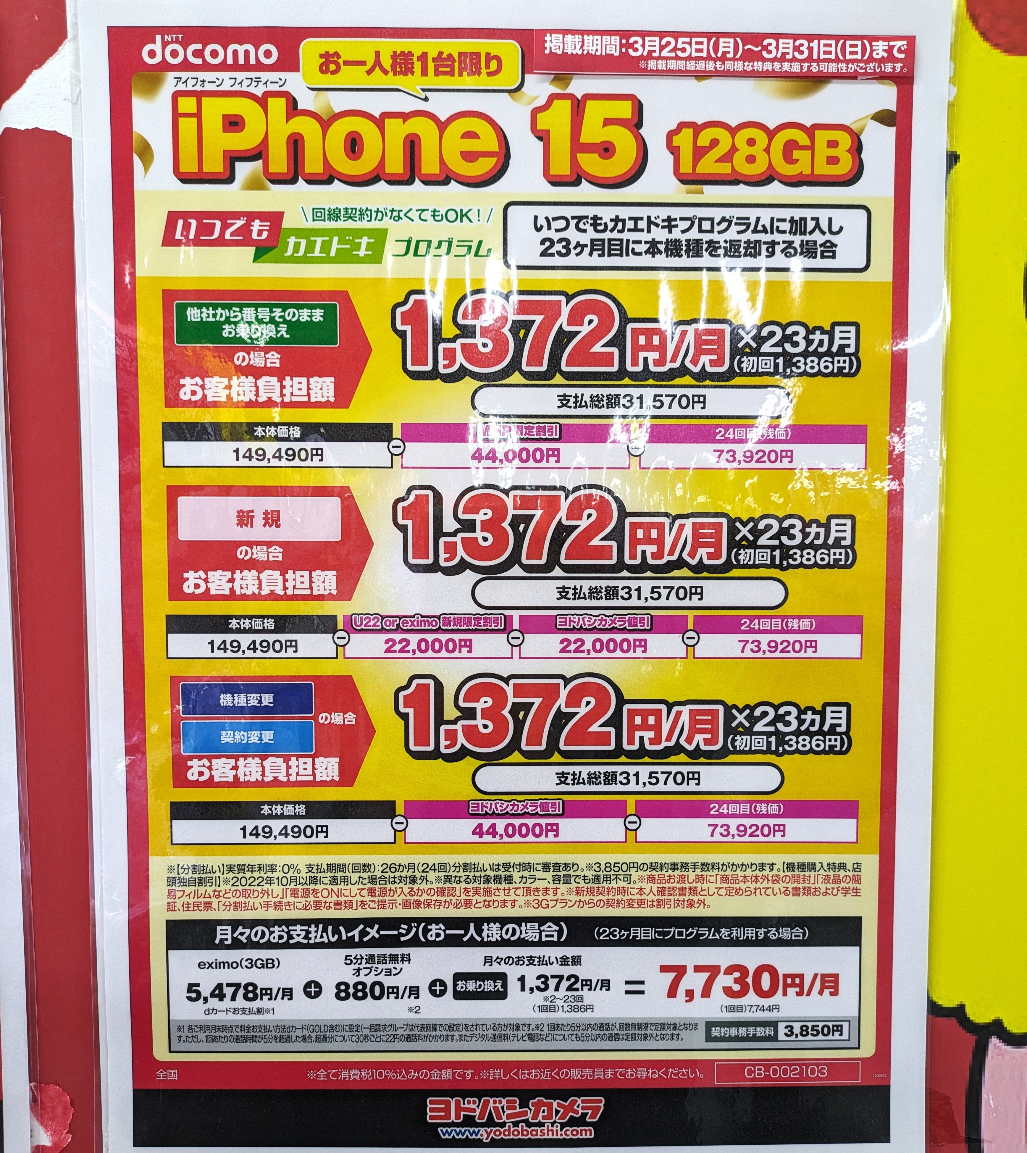 ヨドバシカメラ京都では、ドコモ「iPhone 15 Pro 128GB(税込192,060円)」が機種変更でも33,000円割引で、総額159,060円(税込)となっています。