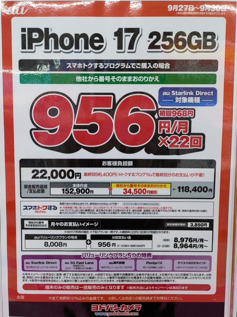 ヨドバシカメラでは、9/19(金)発売のau「iPhone 17 256GB(税込152,900円)」が、MNPで▲34,500円割引になり、総額118,400円(税込)となっています。