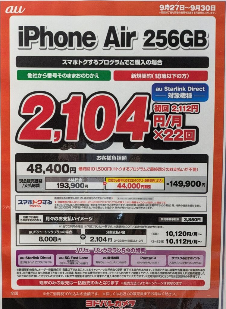 また、au「iPhone Air 256GB(税込193,900円)」が、MNP・U18新規で▲44,000円割引になり、総額149,900円(税込)です。2年返却の実質負担額は48,400円(税込)。