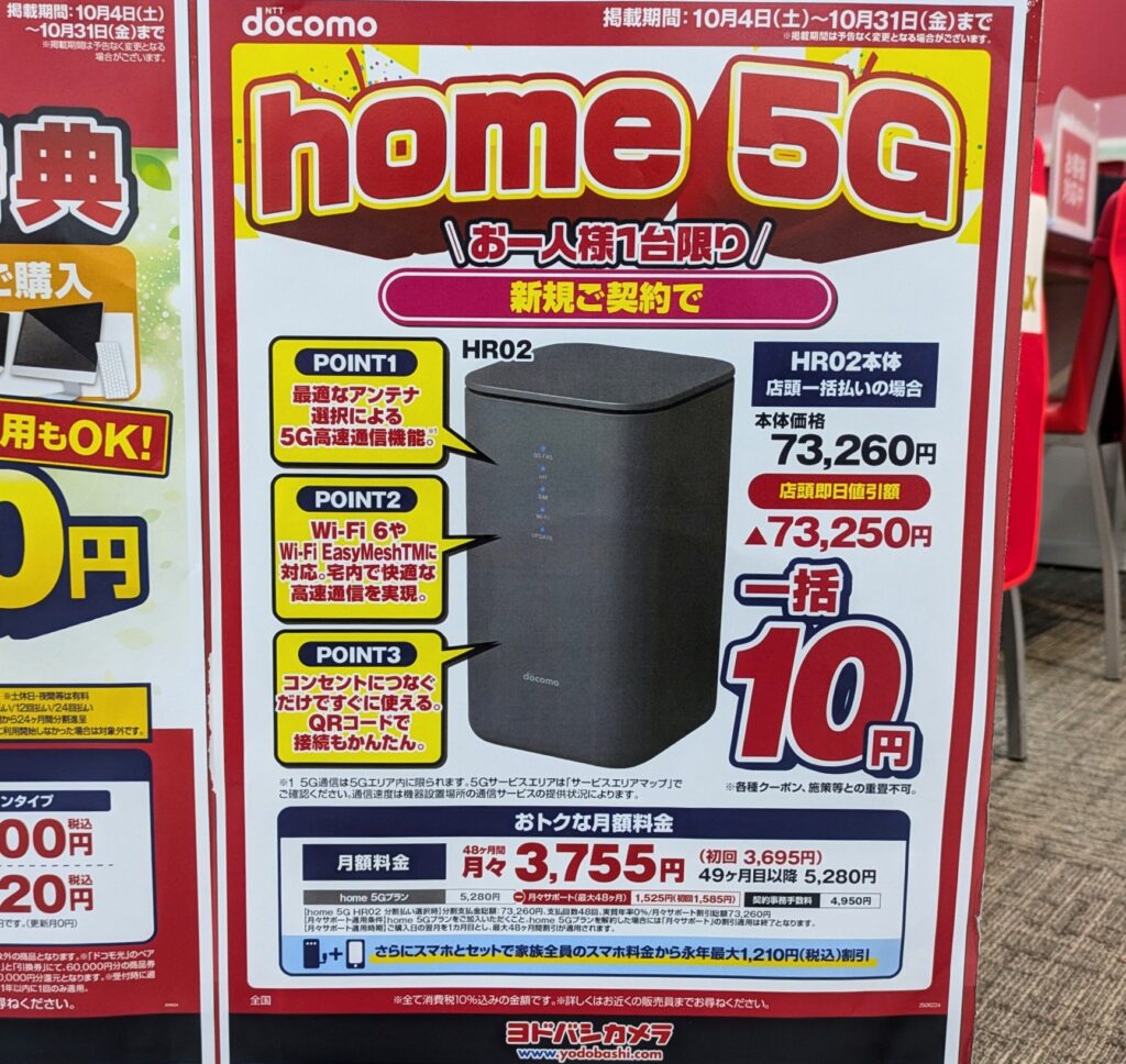 ヨドバシカメラでは、ドコモ「home 5G HR02(税込73,260円)」が新規一括10円となっています。