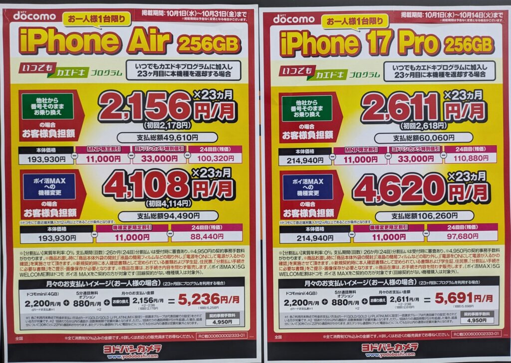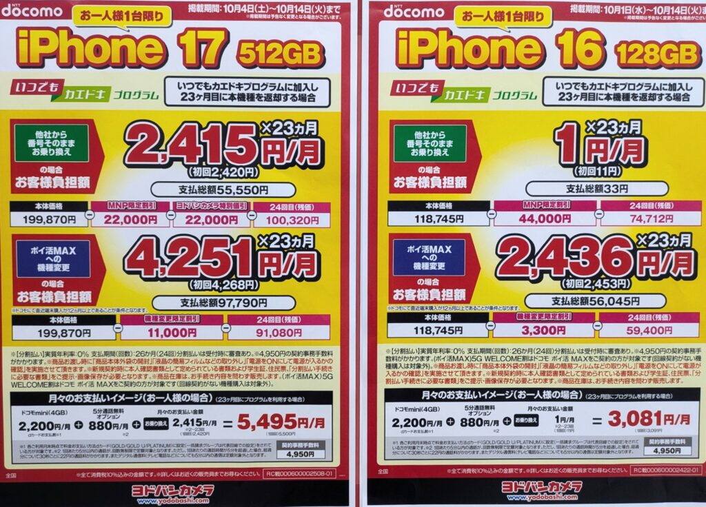 ヤマダデンキも新規一括1円、エディオンは2万円前後です。