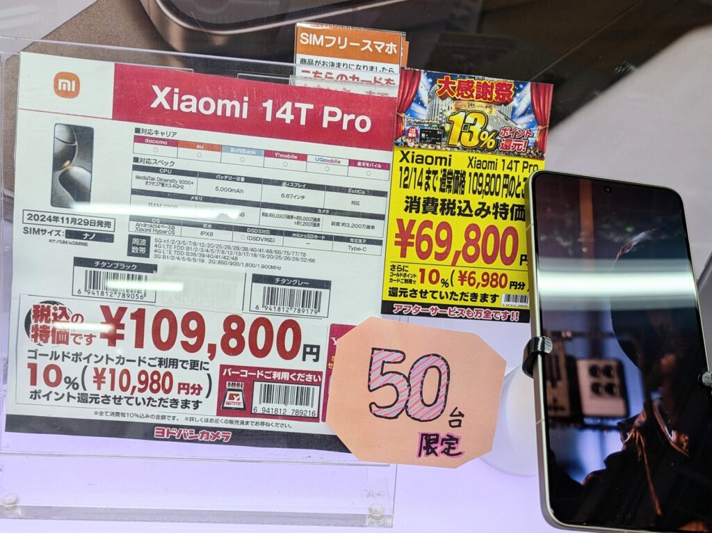 2025年11月22日(土)、ヨドバシカメラ梅田では、2024年11月発売の「Xiaomi 14T Pro」オープンマーケット版が69,800円(税込)に10%ポイント還元となっています。