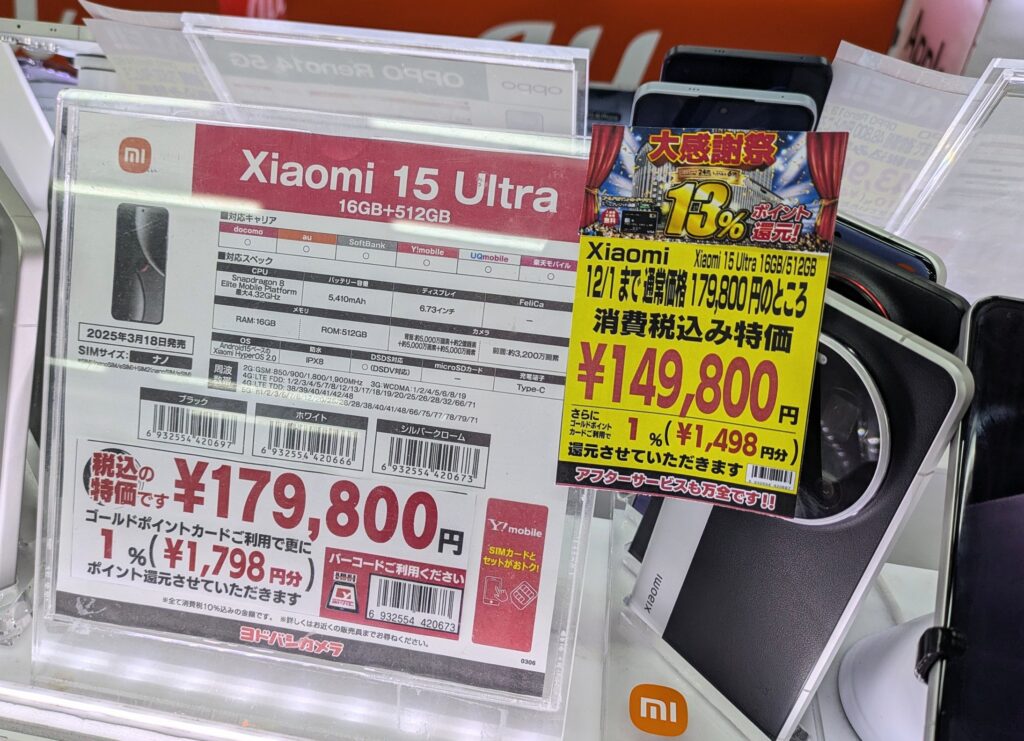 2025年11月15日(土)、ヨドバシカメラ梅田では、2025年4月発売の「Xiaomi 15」SIMフリーが82,250円(税込)となっています。 台数限定。私が見たなかでは過去一の特価かと...
