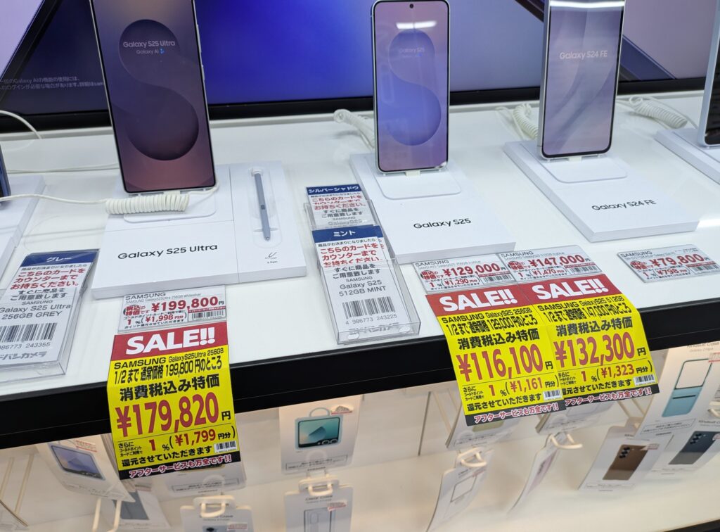 ヨドバシカメラでは、2025年2月発売のオープンマーケット版「Galaxy S25 Ultra 256GB」が、179,820円(税込)に1%ポイント還元となっています。