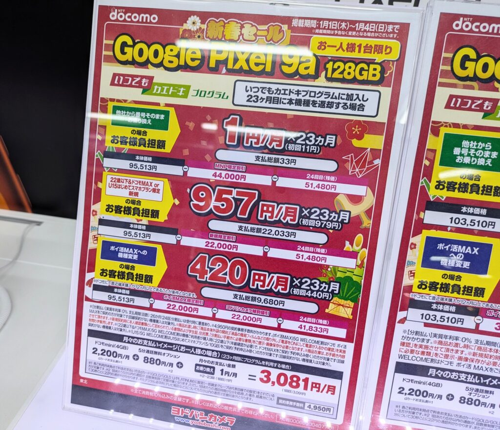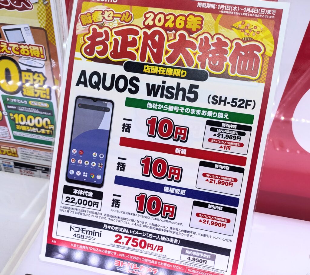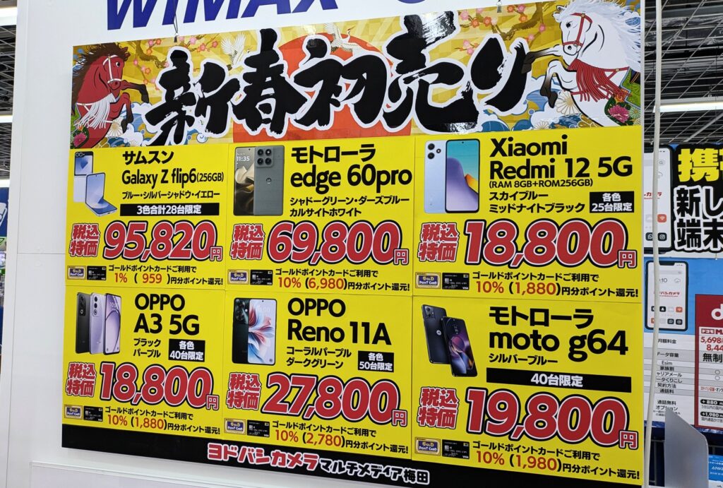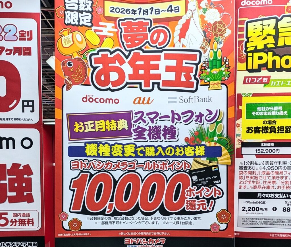 2026年1月1日(木)、ヨドバシカメラ梅田では、ドコモ、au、ソフトバンクの機種変更で、10,000ポイント追加還元となっています。