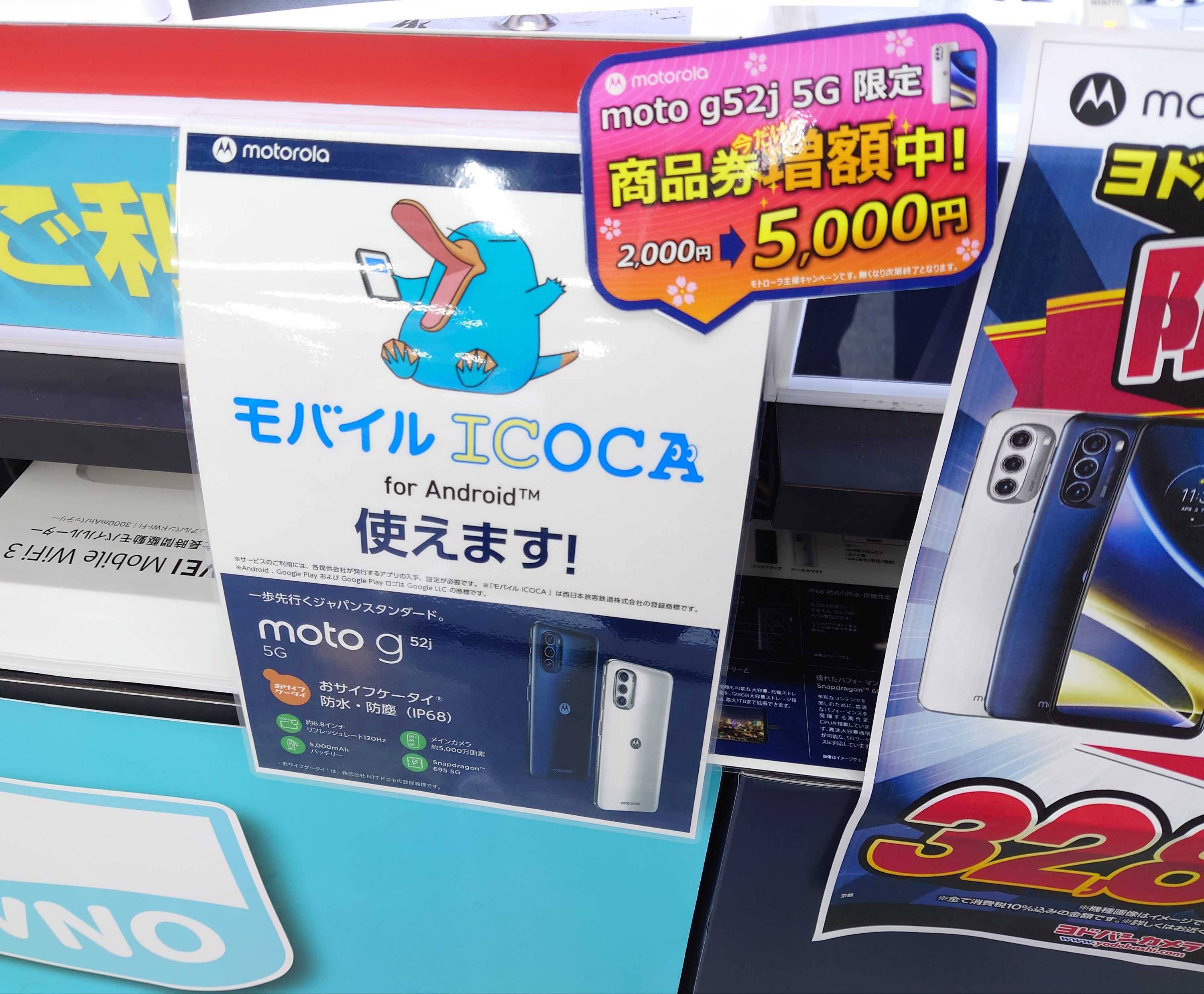 2023年3月18日(土)、ヨドバシカメラ京都では、Motorola初のおサイフ&防水対応スマホ「moto g52j 5G(税込39,800円)」が、単体特価32,800円(税込)の上、さらに5,000円商品券を割引に充てて、27,800円(税込)となっています。ポイントは割引前価格に10%還元が可能で3,280ポイント還元。