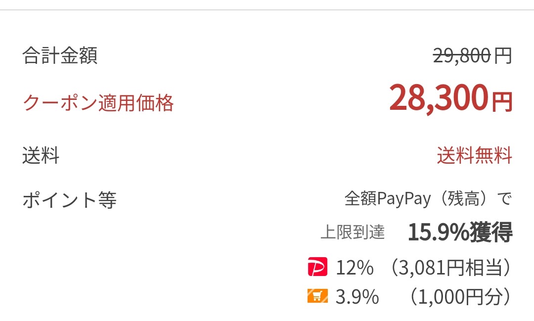 さらにPayPay約3,000円前後、Yahoo!ショッピング商品券約1,000円の還元となります。自身の還元額はYahoo!ショッピングにログインの上、ご確認下さい。